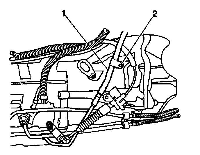 34. Remove the speedometer cable bolt (1), the bracket, and the cable (2) from the transfer case (If 4WD equipped).