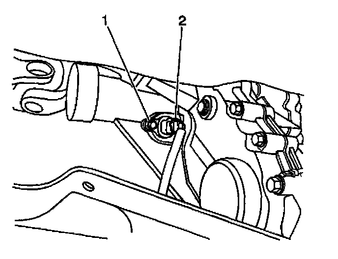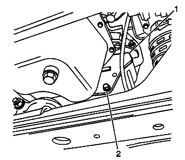 28. Remove the bolts (2) which secure the left side transmission to the engine brace. Remove the brace (1).