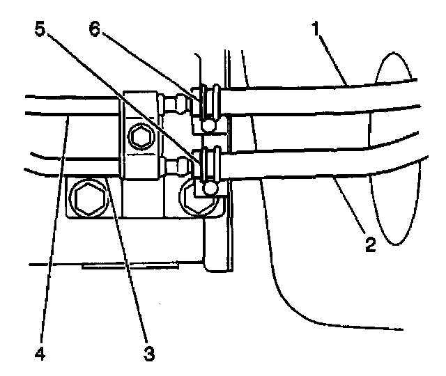 32. Remove the cooler hoses (1,2) and the clamps (5,6) from the transmission pipes (3,4).