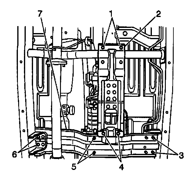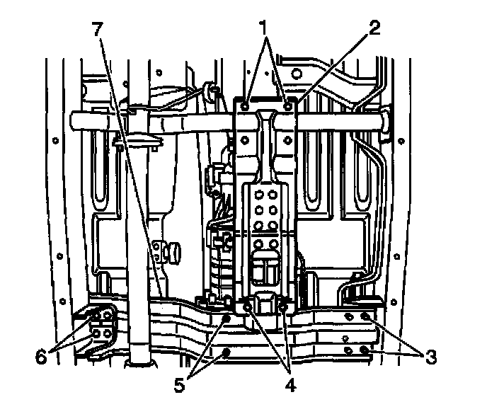 36. Remove the crossmember bolts (3,5,6) and the crossmember (7).