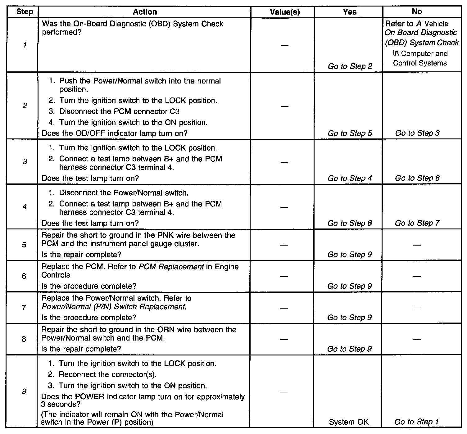 When the ignition switch turns ON, the Powertrain Control Module (PCM) performs a 3-second POWER indicator bulb check. The PCM performs the bulb check by grounding the POWER indicator control circuit. The Power/Normal switch button grounds the shift mode signal circuit to the PCM when the Power/Normal switch sets to POWER. The above condition causes the PCM to ground the POWER indicator control circuit. Grounding the POWER indicator control circuit turns on the POWER indicator lamp located in the instrument panel gauge cluster. The POWER indicator informs the driver that the PCM is using the Power gear shift schedule (delaying upshifting for improved acceleration).