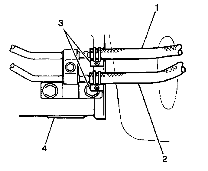 2. Disconnect both of the cooler hoses (1,2) at the clamps (3) on the right side of the transmission (4).