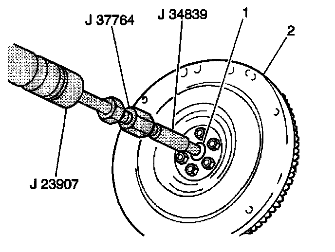 2. Install the clutch disc and the pressure plate to the flywheel (1).