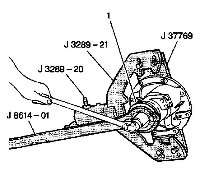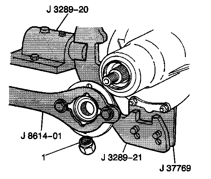 11. Remove the pinion flange nut (1) from the pinion gear using the J 8614-01 to hold the pinion flange stationary.