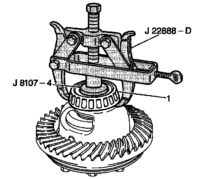 17. Remove the side bearings (1) from the differential case using the J 22888-D with the J 8107-4.