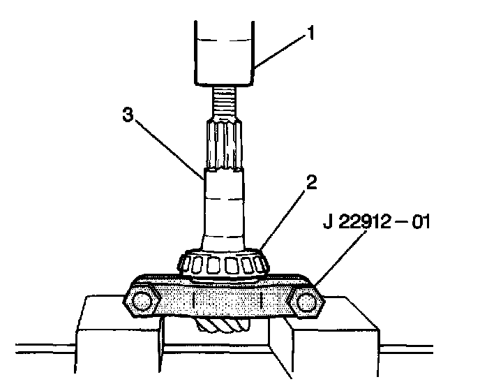 24. Remove the inner pinion bearing (2) and the collapsible spacer from the pinion gear shaft using the J 22912-0 1. Place the J 22912-01 on the pinion gear shaft with the concave side toward the pinion gear. Then place the pinion gear (3) in a hydraulic press (1) and remove the inner pinion bearing.