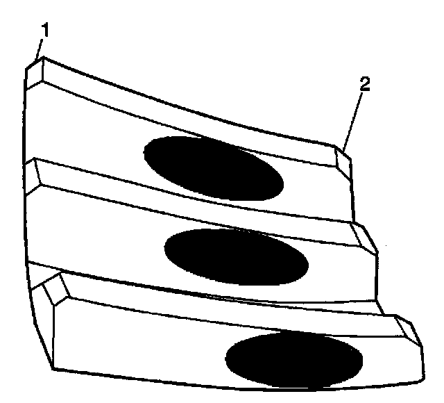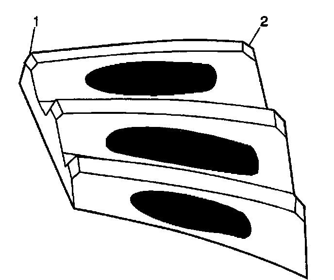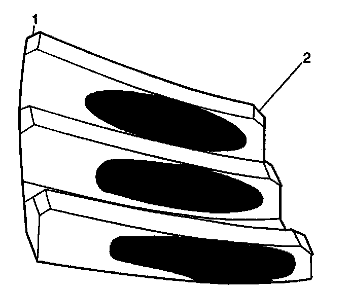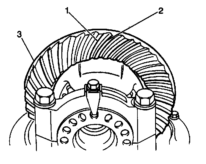 1. Inspect the drive side (2) of the ring gear teeth (concave) and the coast side (1) of the ring gear teeth (convex).