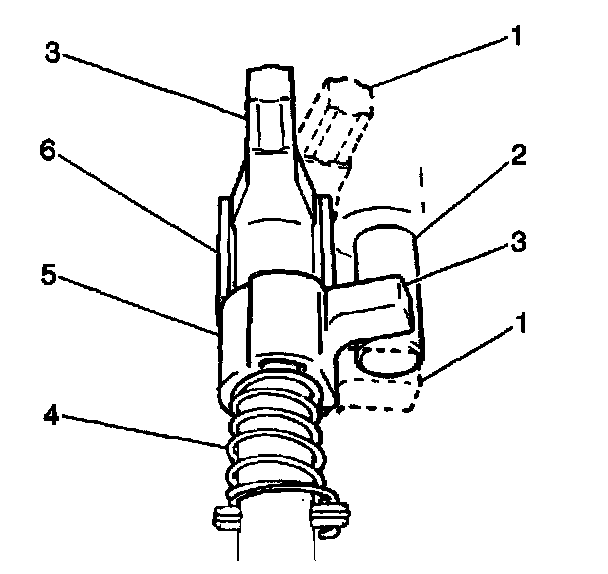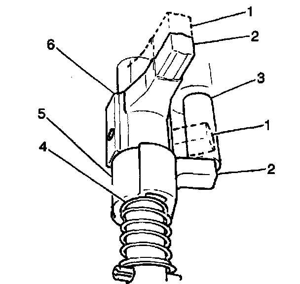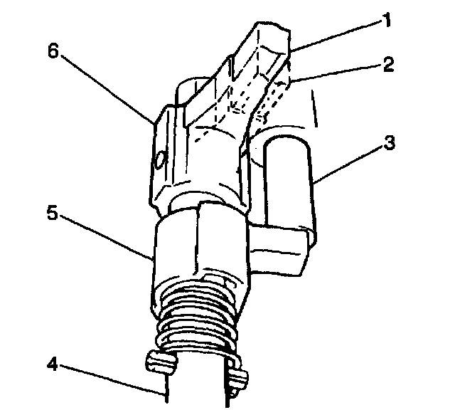 The reverse gearshift limit yoke (5) is located in the gearshift lever case and rides on the gearshift shaft. The reverse gearshift limit yoke prevents the transmission from being shifted directly from fifth gear (1) to reverse. When the transmission shifts into 5th gear, the gearshift limit spring (4) turns the gearshift limit yoke clockwise causing the reverse gearshift limit yoke to land on the reverse gearshift limit bolt (3). This action prevents a 5th-to-reverse gearshift.