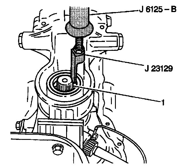 4. Remove the extension case oil seal (1) from the extension case using the J 23129 and the J 6125-B.