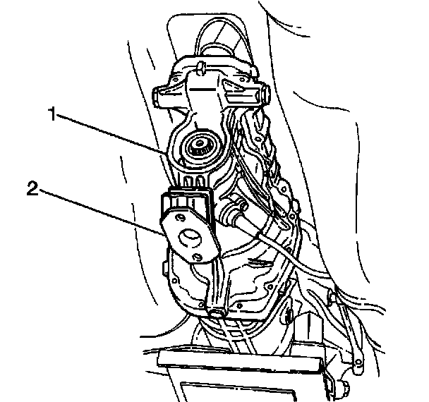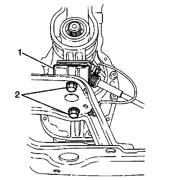 15. Remove the one bolt and the rear transmission mount (2) from the extension case (1).