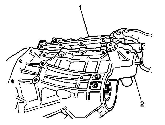 20. Remove the twelve bolts (2) and the extension case (1) from the transmission.