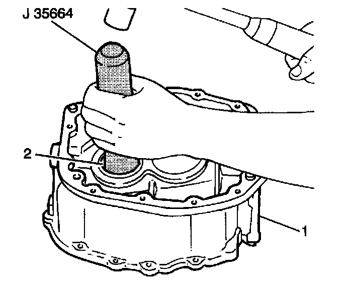 5. Remove the rear case countershaft plug (2) from the rear case (1) using the J 35664 and a hammer.
