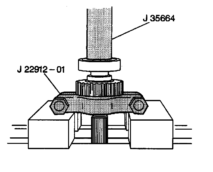 12. Use the J 35664 with the, J 22912-01 and a press arbor in order to install the front output shaft bearings onto the front output shaft.