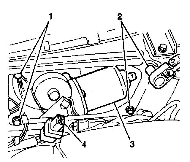 3. Install the front wiper motor (3) to the bulkhead. Secure the front wiper motor with 4 mounting bolts (1).