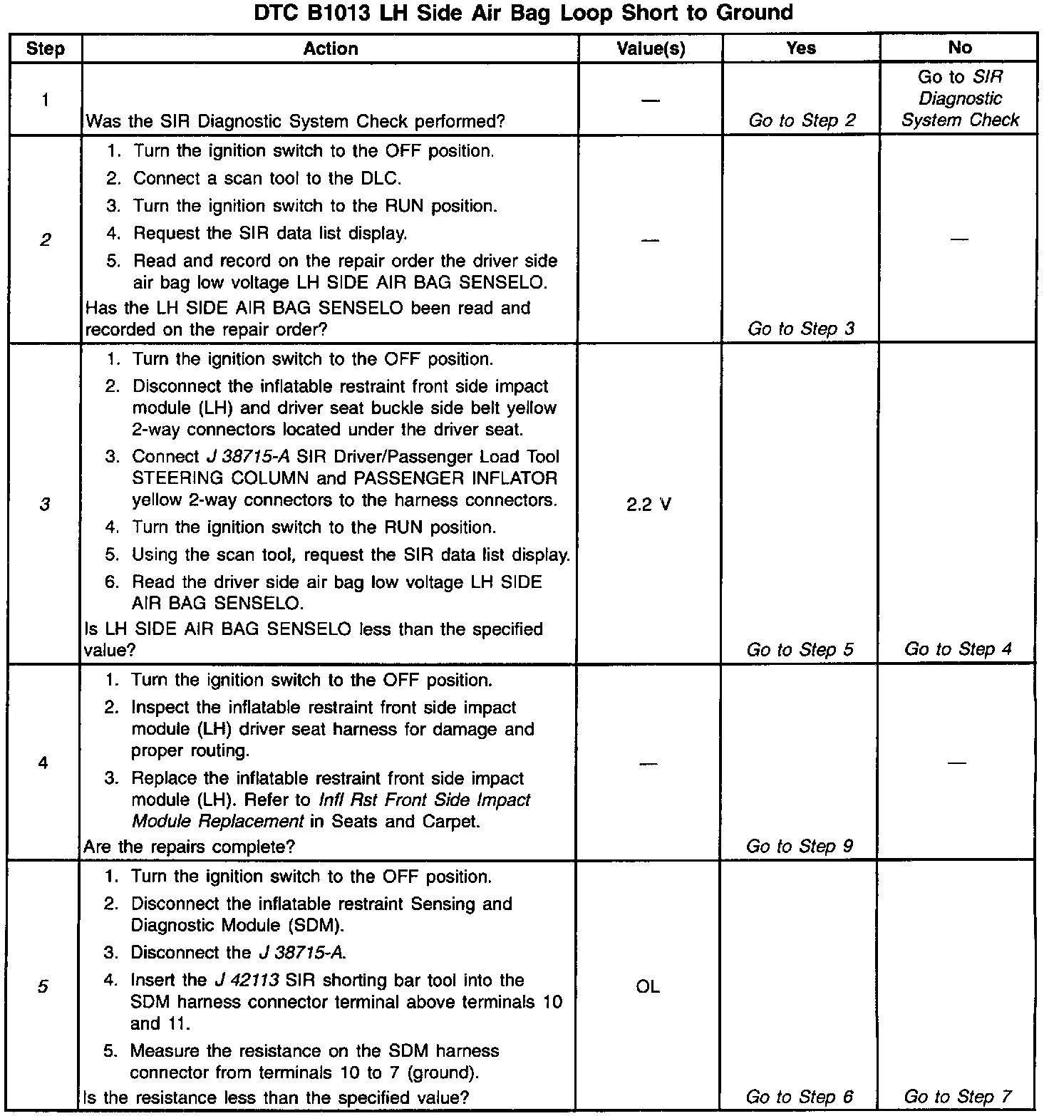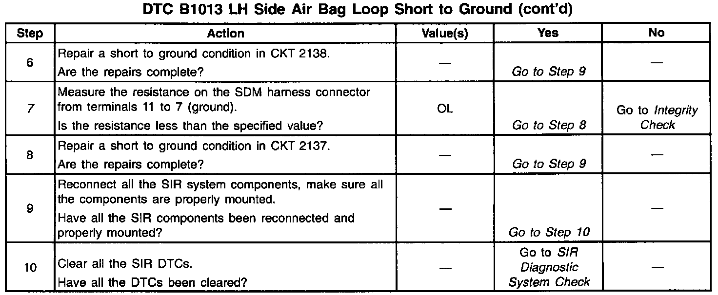 A short to ground in the inflatable restraint driver seat module circuit can cause an intermittent condition. Inspect CKT 2137 and CKT 2138 carefully for cutting or chafing. Wiring pigtail damage requires replacement of the inflatable restraint driver seat module. The diagnostic table directs the technician to note the entry value of LH SIDE AIR BAG SENSELO. Comparing the value of LH SIDE AIR BAG SENSELO can be helpful in determining if an intermittent condition exists.