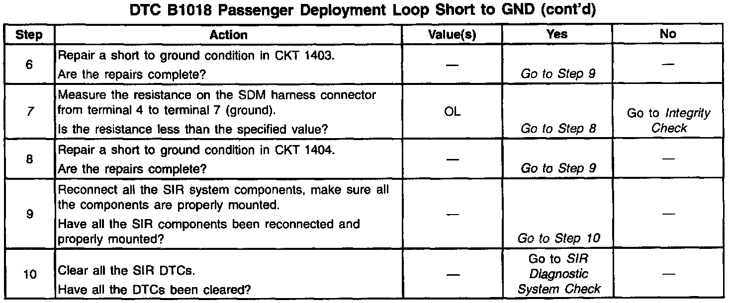 A short-to-B+ in the inflatable restraint IP module circuit can cause an intermittent condition. Inspect CKT 1403 and CKT 1404 carefully for cutting or chafing. Wiring pigtail damage requires replacement of the inflatable restraint IP module. The diagnostic table directs the technician to note the entry value of PASSENGER SENSELO. Comparing the value of PASSENGER SENSELO can be helpful in determining if an intermittent condition exists.