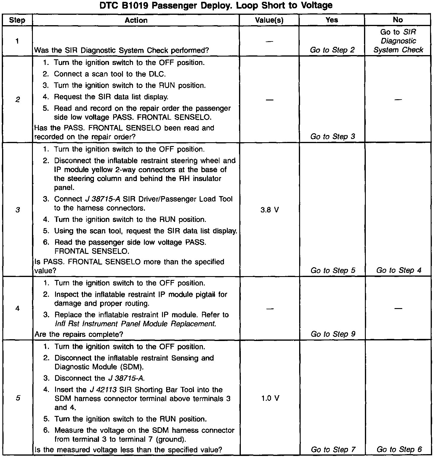 A short-to-B+ in the inflatable restraint IP module circuit can cause an intermittent condition. Inspect CKT 1403 and CKT 1404 carefully for cutting or chafing. Wiring pigtail damage requires replacement of the inflatable restraint IP module. The diagnostic table directs the technician to note the entry value of PASSENGER SENSELO. Comparing the value of PASSENGER SENSELO can be helpful in determining if an intermittent condition exists.