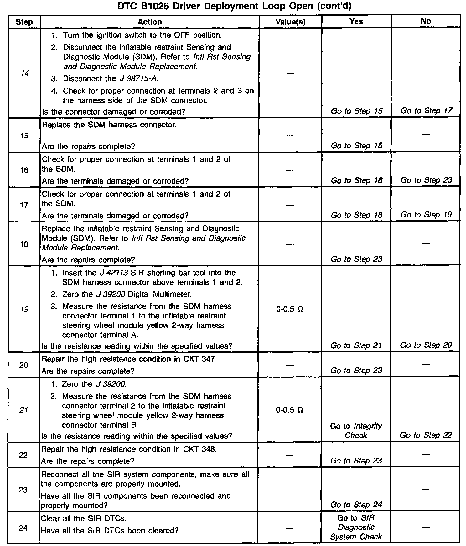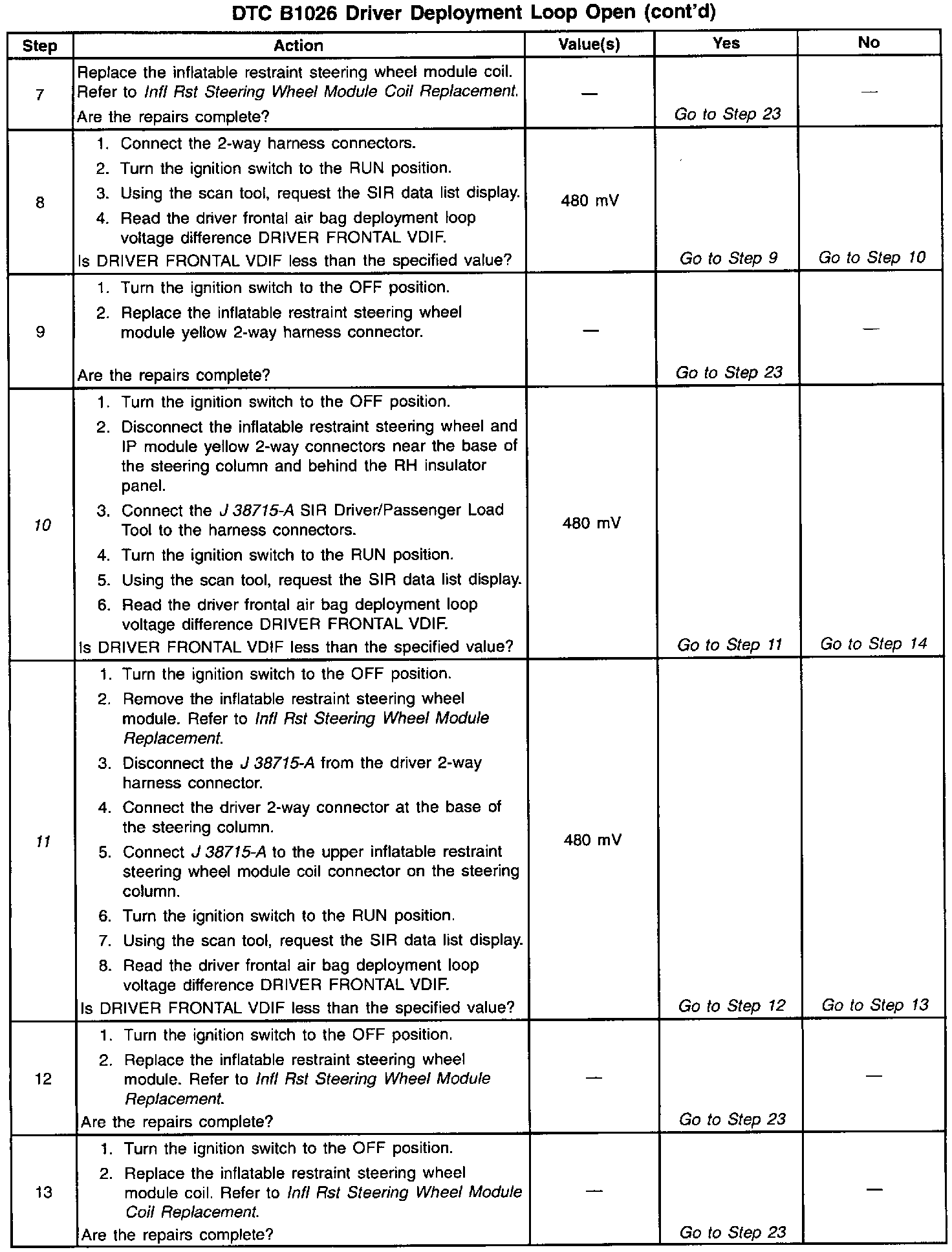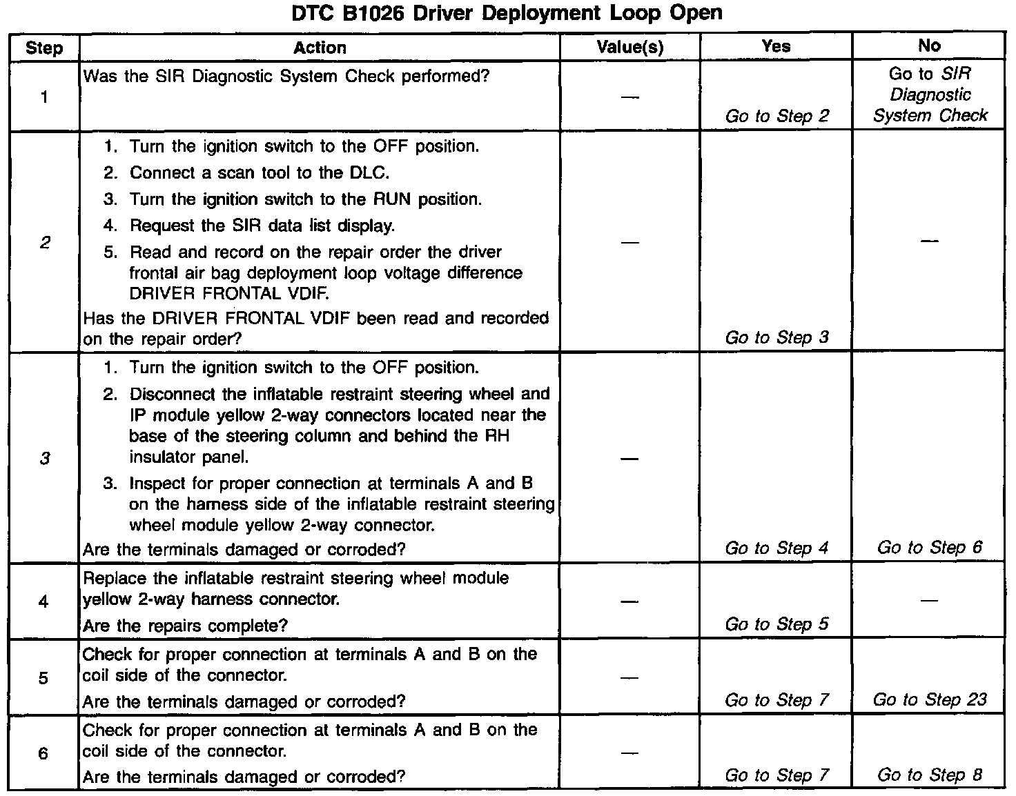 An intermittent open in the inflatable restraint steering wheel module coil could also set this DTC. To test for a bad inflatable restraint steering wheel module coil, clear the DTCs, then turn the steering wheel back and forth with the ignition switch in the RUN position. If the AIR BAG warning lamp comes ON and DTC B1026 has set again, it is likely the inflatable restraint steering wheel module coil is malfunctioning.
