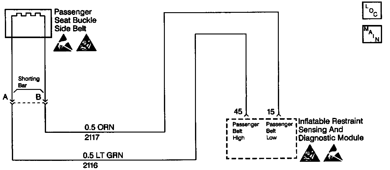 When you first turn the ignition switch to the RUN position, the inflatable restraint sensing and diagnostic module (SDM) performs tests to diagnose critical malfunctions within itself. Next the SDM measures IGNITION voltage to make sure it is within its respective normal voltage range. Then the SDM proceeds with the DEPLOYMENT LOOP CONTINUITY test. During the DEPLOYMENT LOOP CONTINUITY test, the SDM measures the voltage difference between Passenger Belt High and Passenger Belt Low.