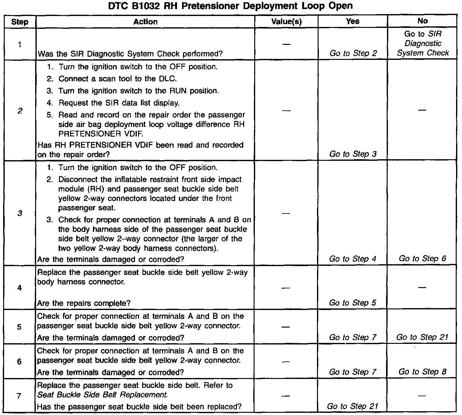 - A poor connection at the passenger seat buckle side belt harness connector terminals A and B.