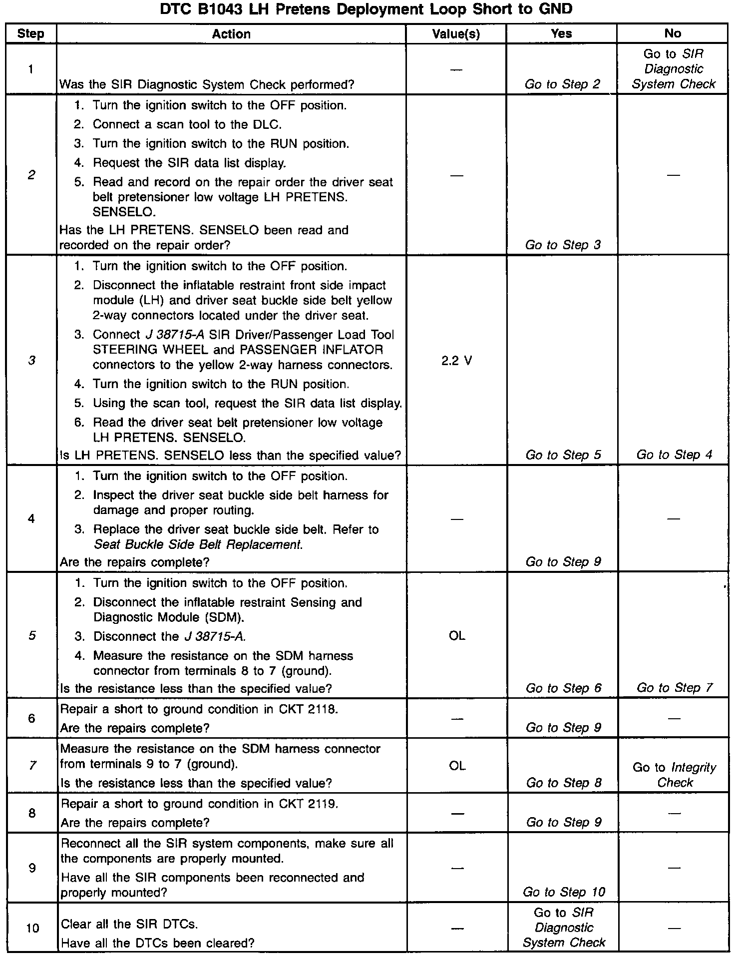 A short to ground in the inflatable restraint driver seat module circuit can cause an intermittent condition. Inspect CKT 2118 and CKT 2119 carefully for cutting or chafing. Wiring pigtail damage requires replacement of the inflatable restraint driver seat module. The diagnostic table directs the technician to note the entry value of LH PRETENS. SENSELO. Comparing the value of LH PRETENS. SENSELO can be helpful in determining if an intermittent condition exists.