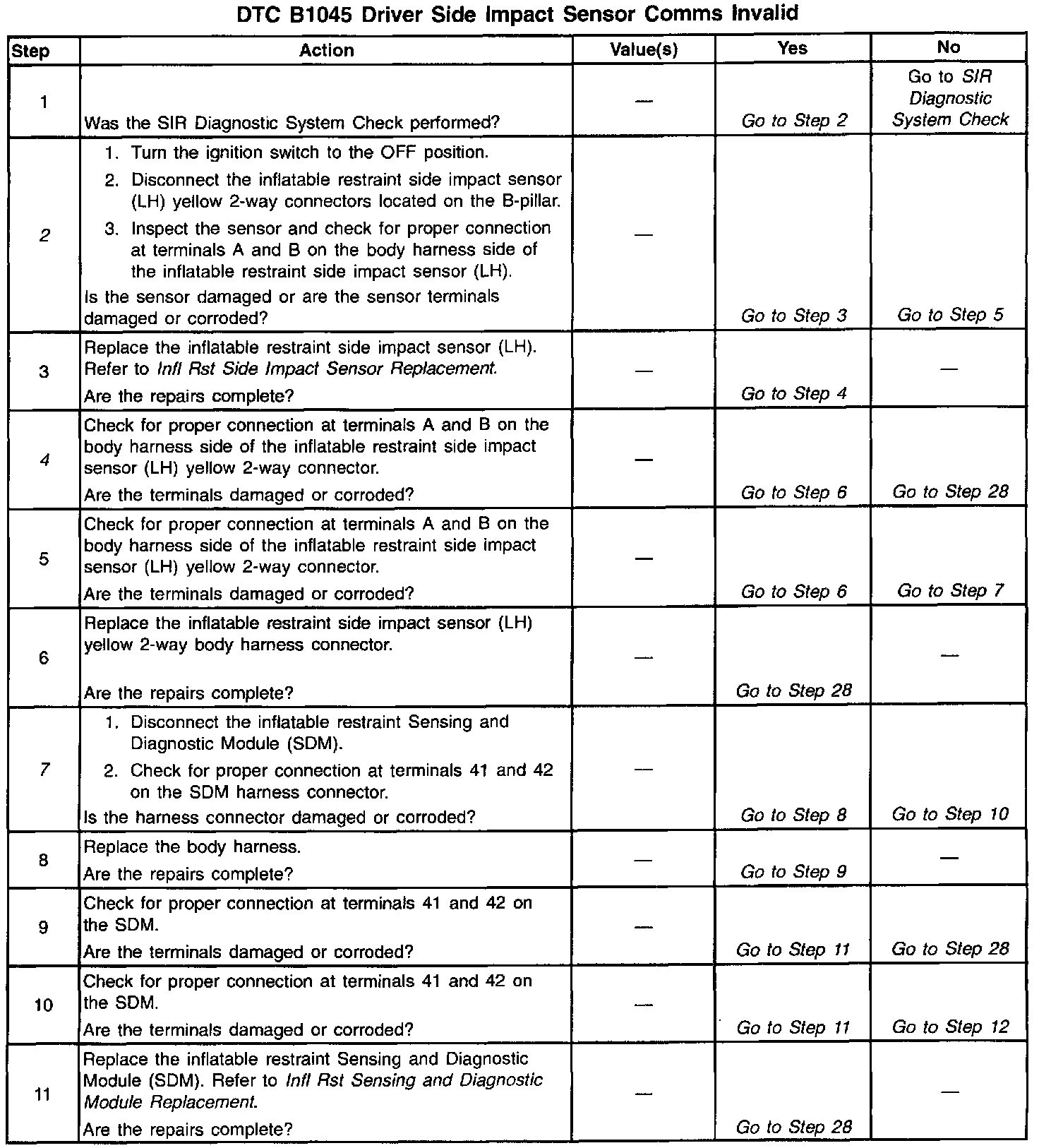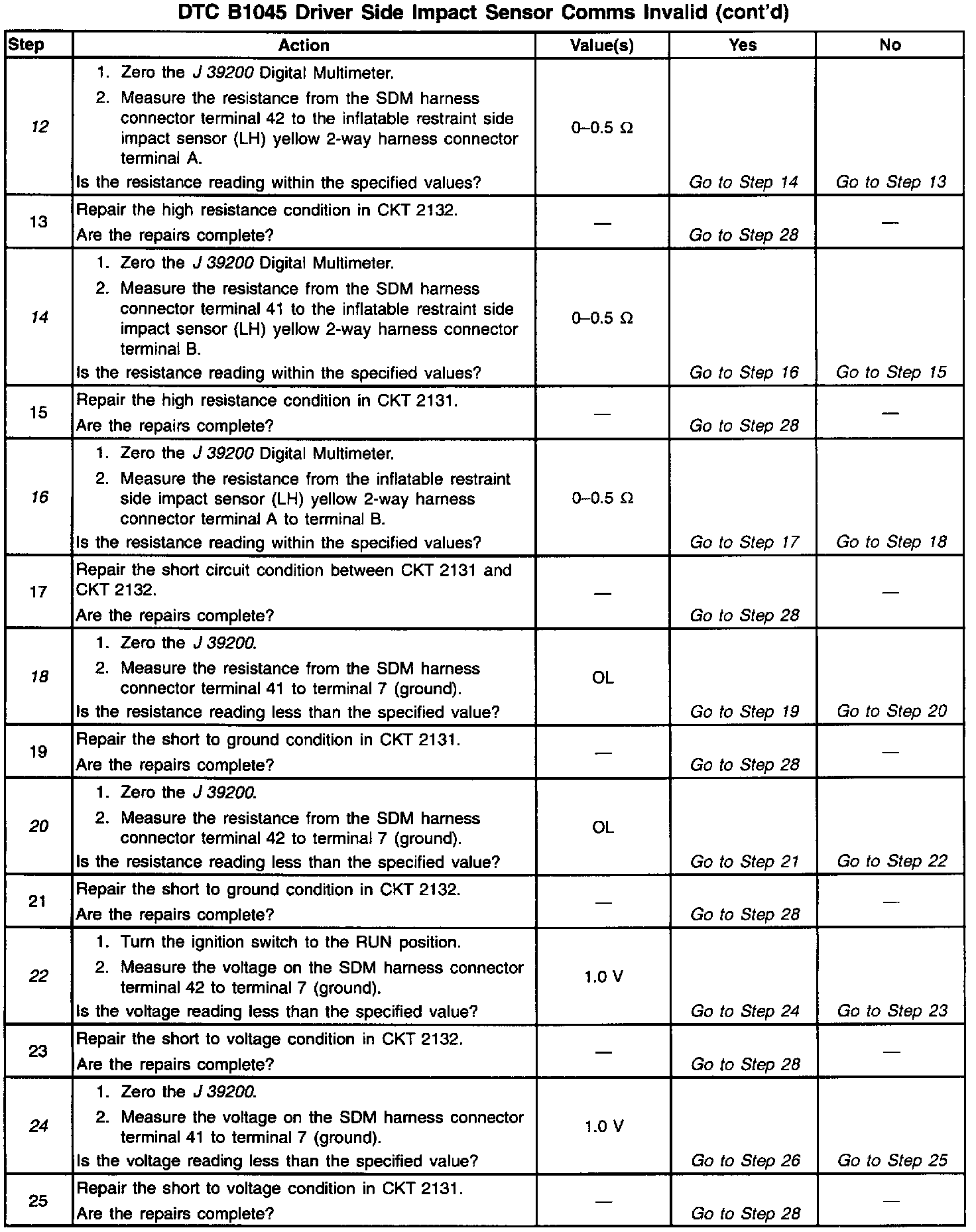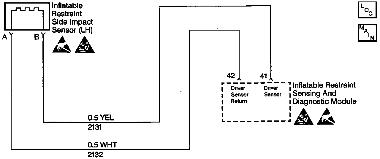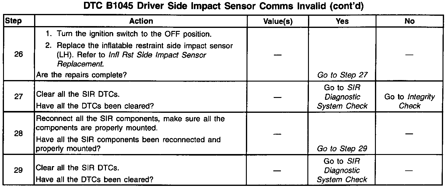 An inflatable restraint driver side impact sensor (SIS) circuit short to ground can cause an intermittent condition. Inspect CKT 2131 and CKT 2132 carefully for cutting and/or chafing. A careful inspection of the circuits and components indicated on the DTC B1045 Table is essential to make sure that the replacement SDM will not be damaged.