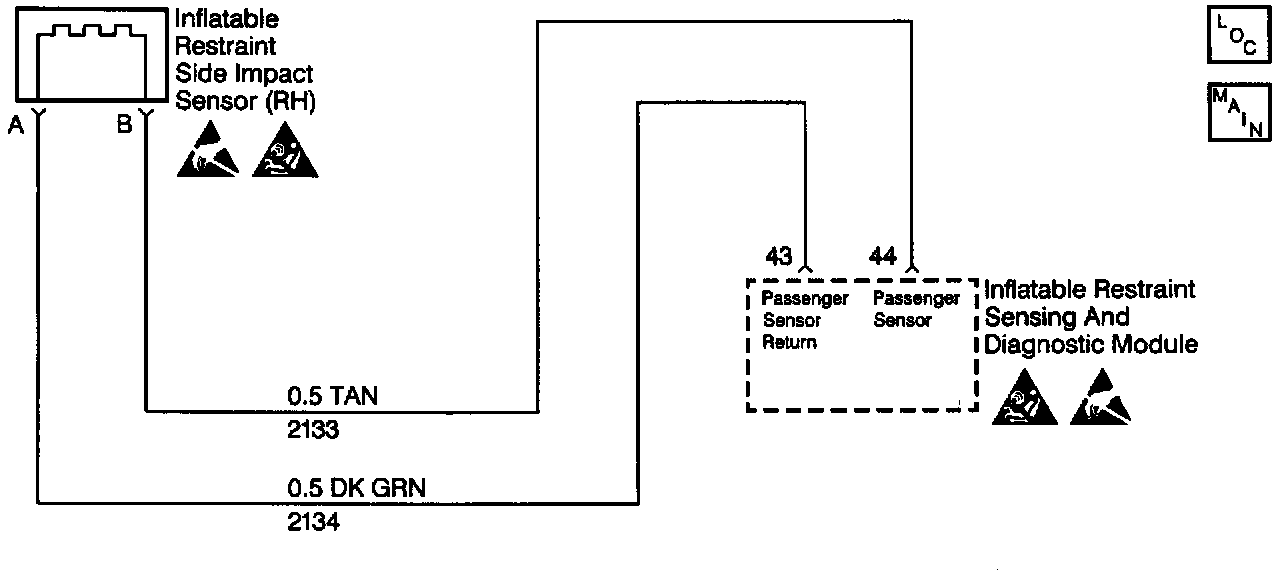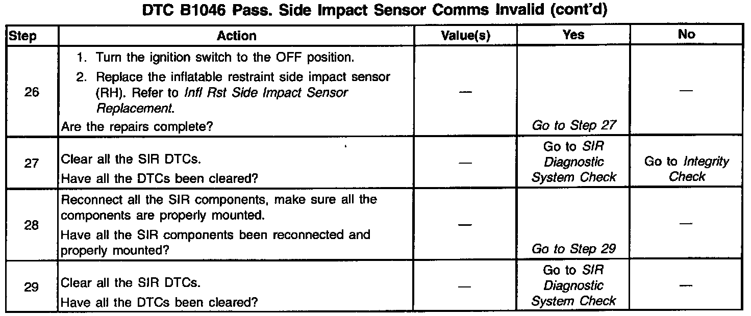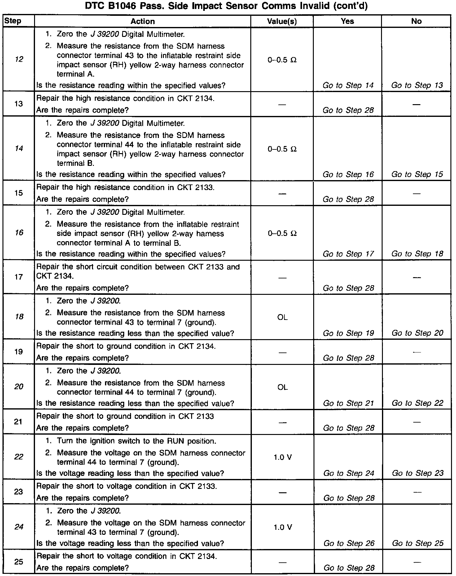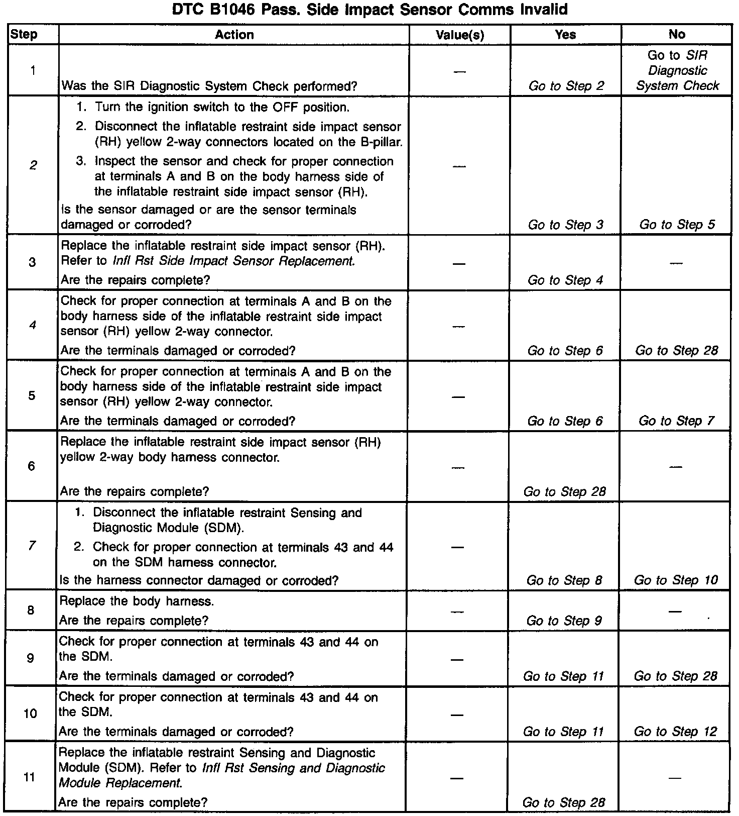An inflatable restraint passenger side impact sensor (SIS) circuit short to ground can cause an intermittent condition. Inspect CKT 2133 and CKT 2134 carefully for cutting and/or chafing. A careful inspection of the circuits and components indicated on the DTC B1046 Table is essential to make sure that the replacement SDM will not be damaged.