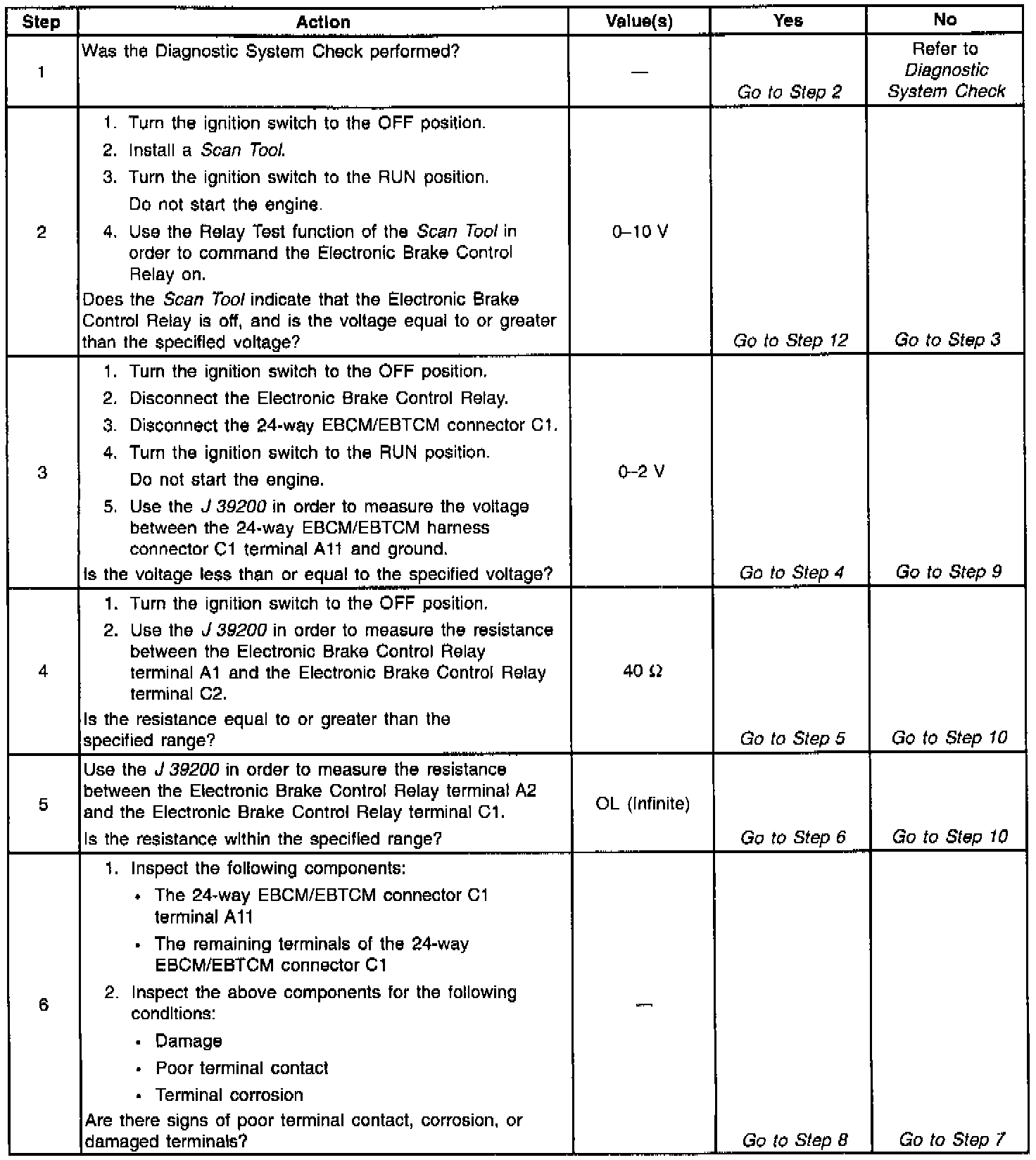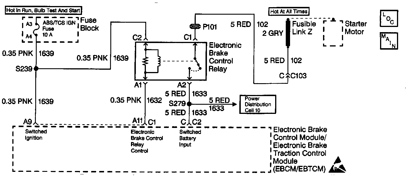 Ignition voltage is supplied through terminal C2 of the Electronic Brake Control Relay. The above enables the EBCM/EBTCM to energize the puffin coil by completing the ground circuit at connector C1 terminal All of the EBCM/EBTCM. The magnetic field created closes the Electronic Brake Control Relay contacts. The magnetic field also allows battery voltage and current through the Electronic Brake Control Relay terminal C1 to be supplied to the EBCM/EBTCM through connector C2 terminal C. Connector C2 terminal C and to the Brake Solenoid Valves through S279.