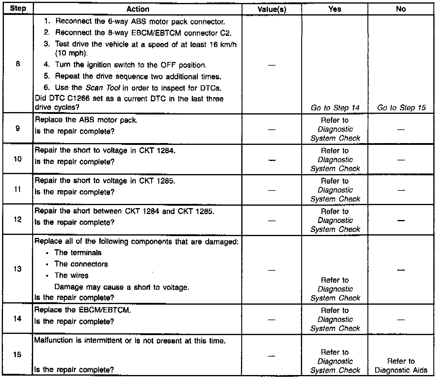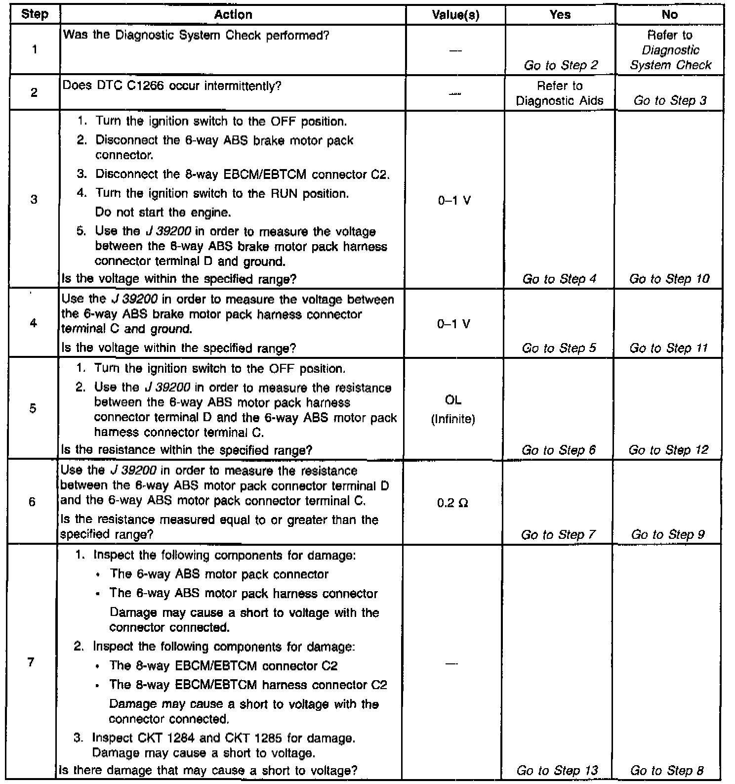 DTC 1266 identifies an ABS motor circuit that shorts to voltage or an ABS motor that has low or zero resistance. The malfunction will cause one of the following conditions to occur:
