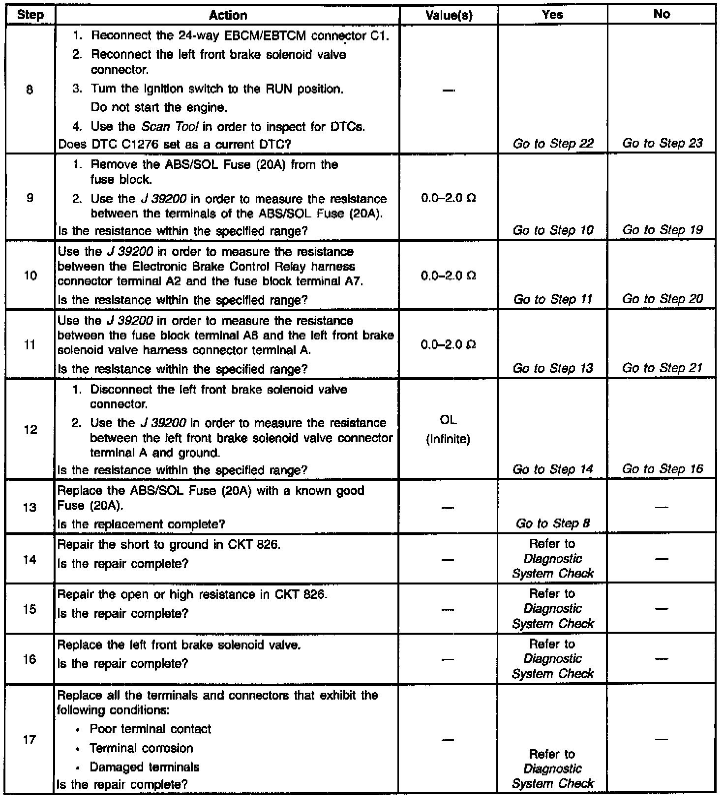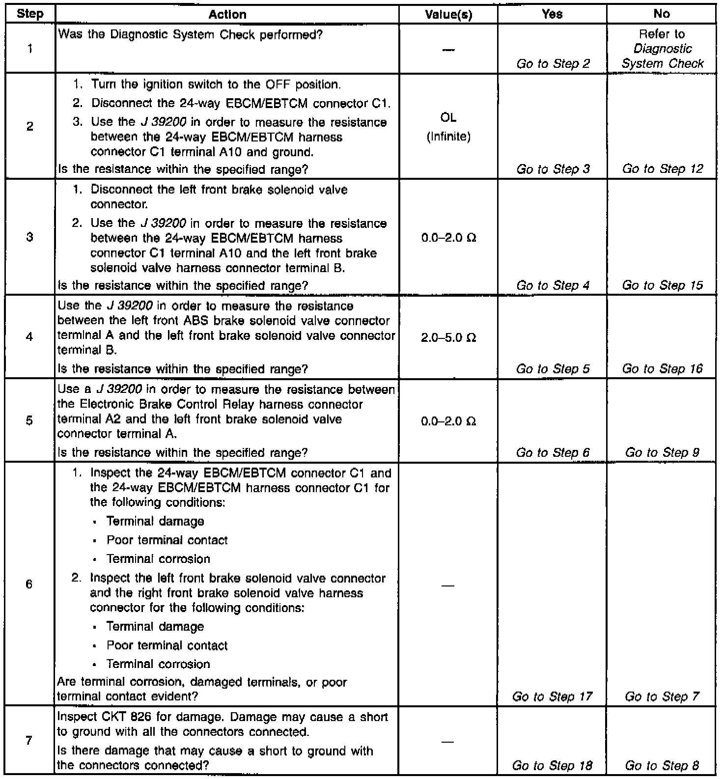 A malfunction exists if the EBCM/EBTCM detects the left front brake solenoid valve control circuit voltage is not within specifications.