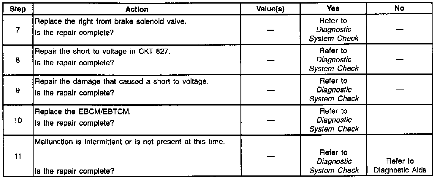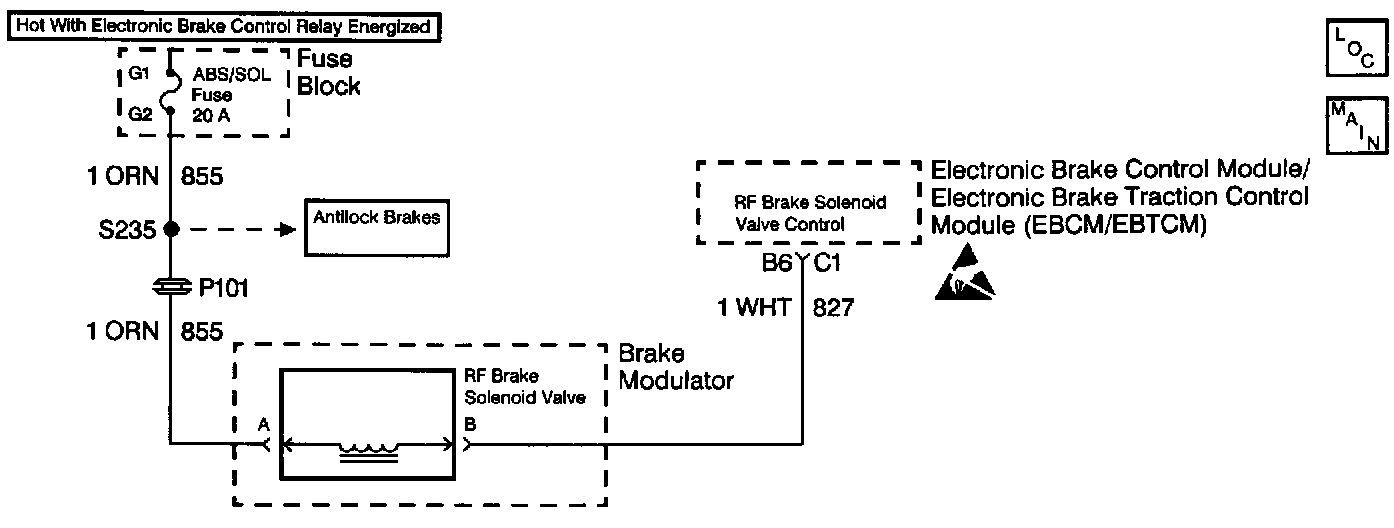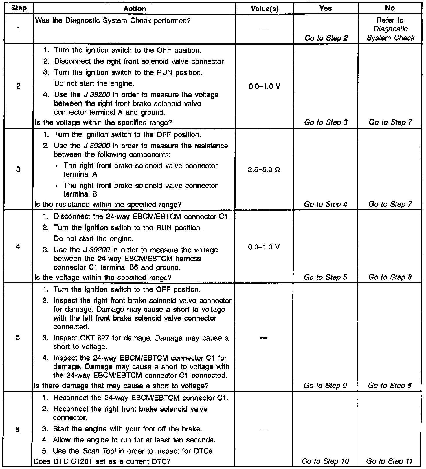A malfunction exists if the EBCM/EBTCM detects the right front brake solenoid valve control circuit voltage is not within specifications.