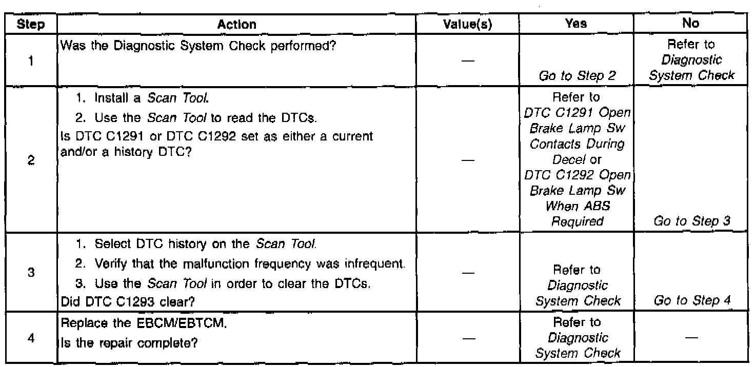 DTC C1293 is the second portion of DTC C1291 and DTC C1292. If DTC 1291 or DTC 1292 failed during the last ignition cycle, DTC C1293 becomes a current failure during the next ignition cycle. DTC C1293 failure keeps ABS/TCS disabled until identifying a brake switch on state. When identifying a change during an ignition cycle in which DTC C1293 is a current malfunction, DTC C1291 or DTC 1292 will clear itself at the end of the current ignition cycle. ABS/TCS will then enable itself at the start of the next ignition cycle. DTC C1293 alone indicates DOT Ct291 or DTC C1292 failed previously, but is intermittent, or has been corrected.