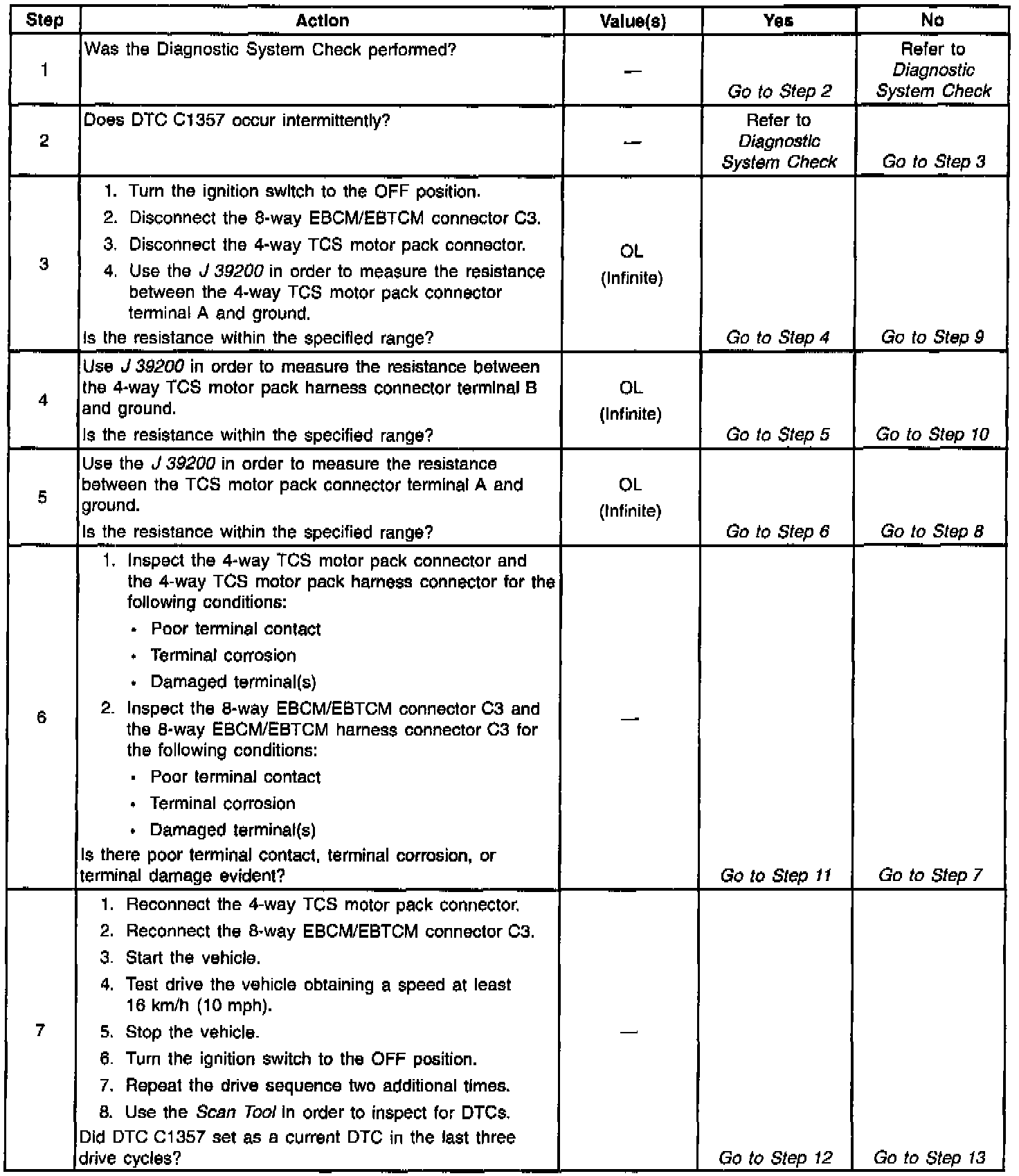 DTC C1357 identifies a Traction Control System (TCS) motor circuit that shorts to ground. DTC C1357 will cause one of the following conditions: