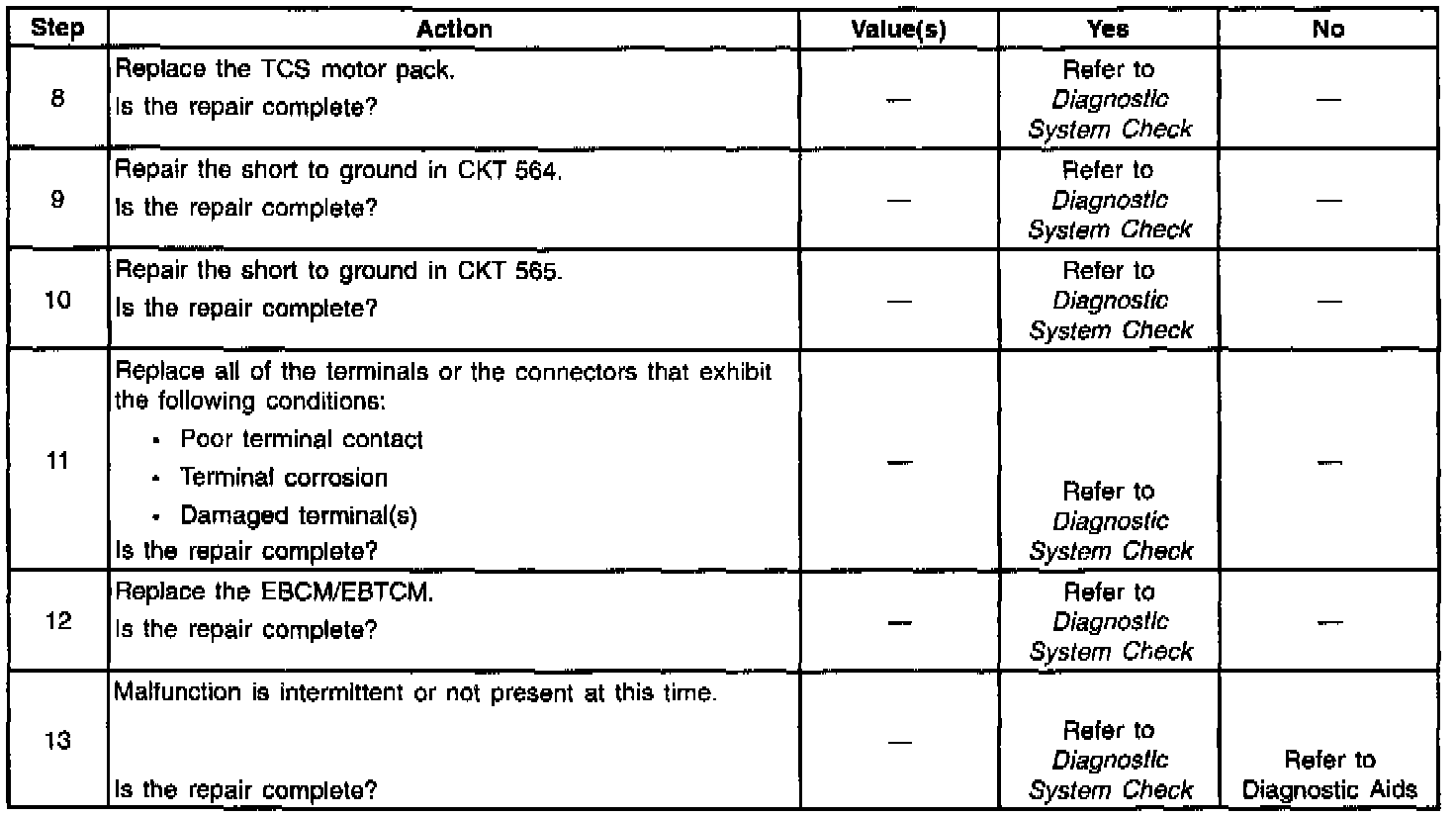 A malfunction exists if the EBCM/EBTCM detects an out of range voltage on either of the left front TCS motor circuits indicating a short to ground.