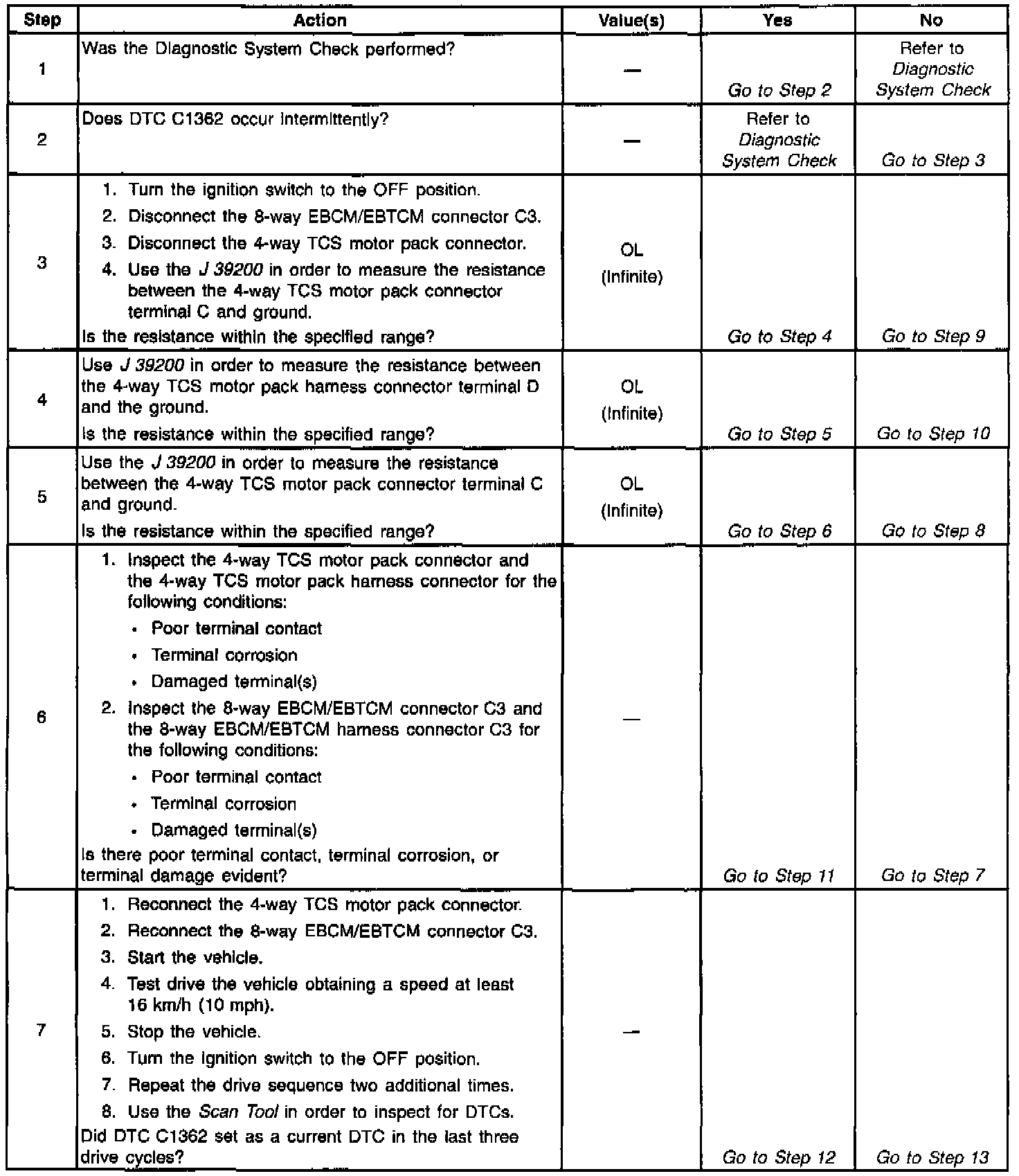 DTC C1362 identifies a Traction Control System (TCS) motor circuit that shorts to ground. DTC C1362 will cause one of the following conditions: