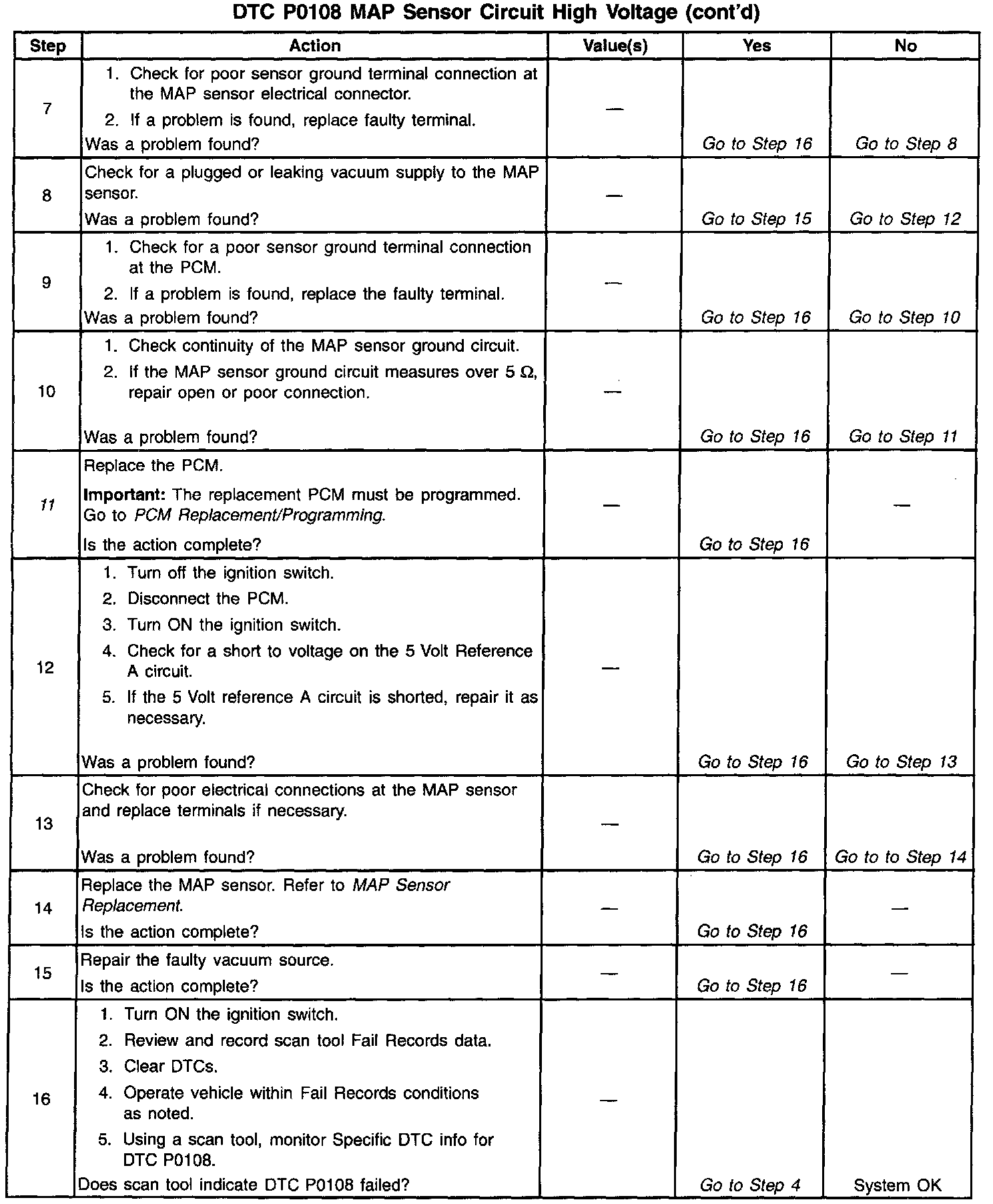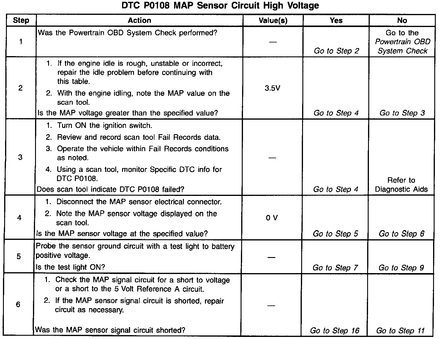 The PCM monitors the MAP signals for voltages outside the normal range of the MAP sensor. If the PCM detects a MAP signal voltage that is excessively high, DTC P0108 will be set.
