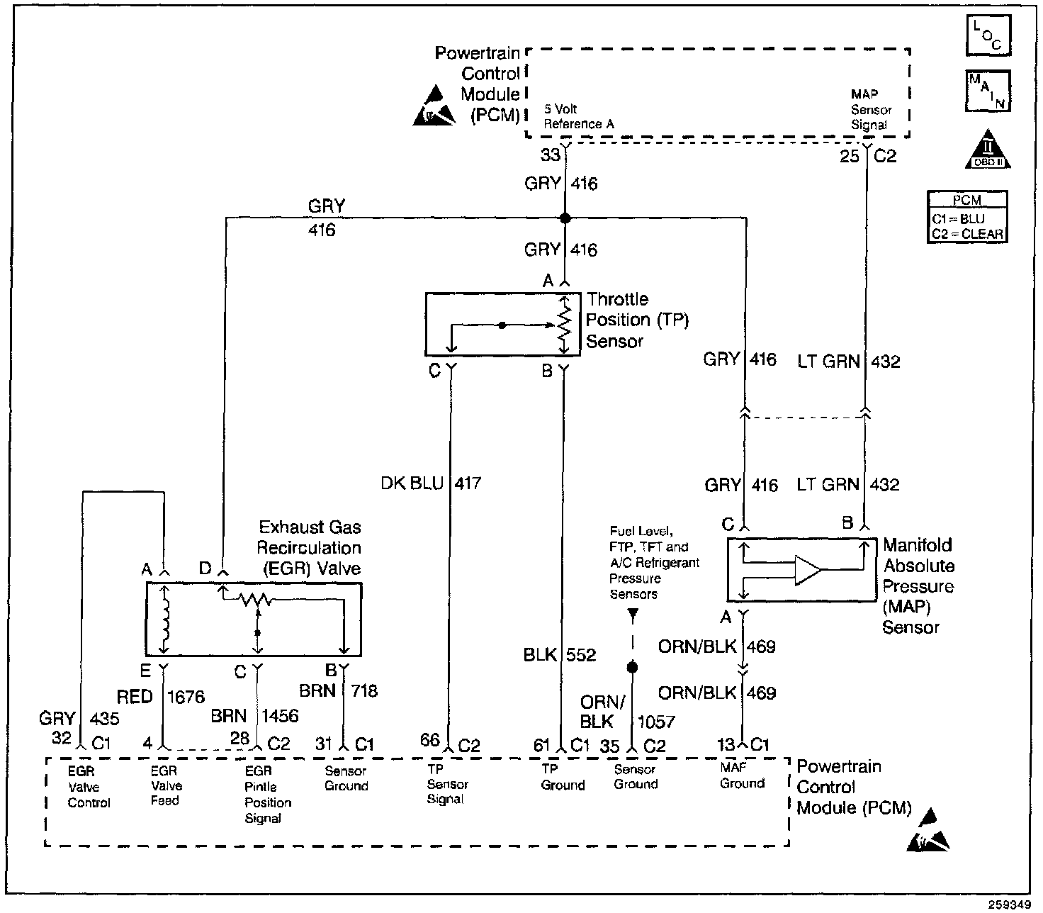 The Manifold Absolute Pressure (MAP) sensor responds to changes in intake manifold pressure (vacuum). The MAP sensor signal voltage to the PCM varies from below 2 volts at idle (high vacuum) to above 4 volts with the key ON, engine not running or at wide-open throttle (low vacuum). The MAP sensor is used to determine manifold pressure changes while the linear EGR flow test diagnostic is being run (refer to DTC P0401), to determine engine vacuum level for some other diagnostics and to determine barometric pressure (BARO). P0401