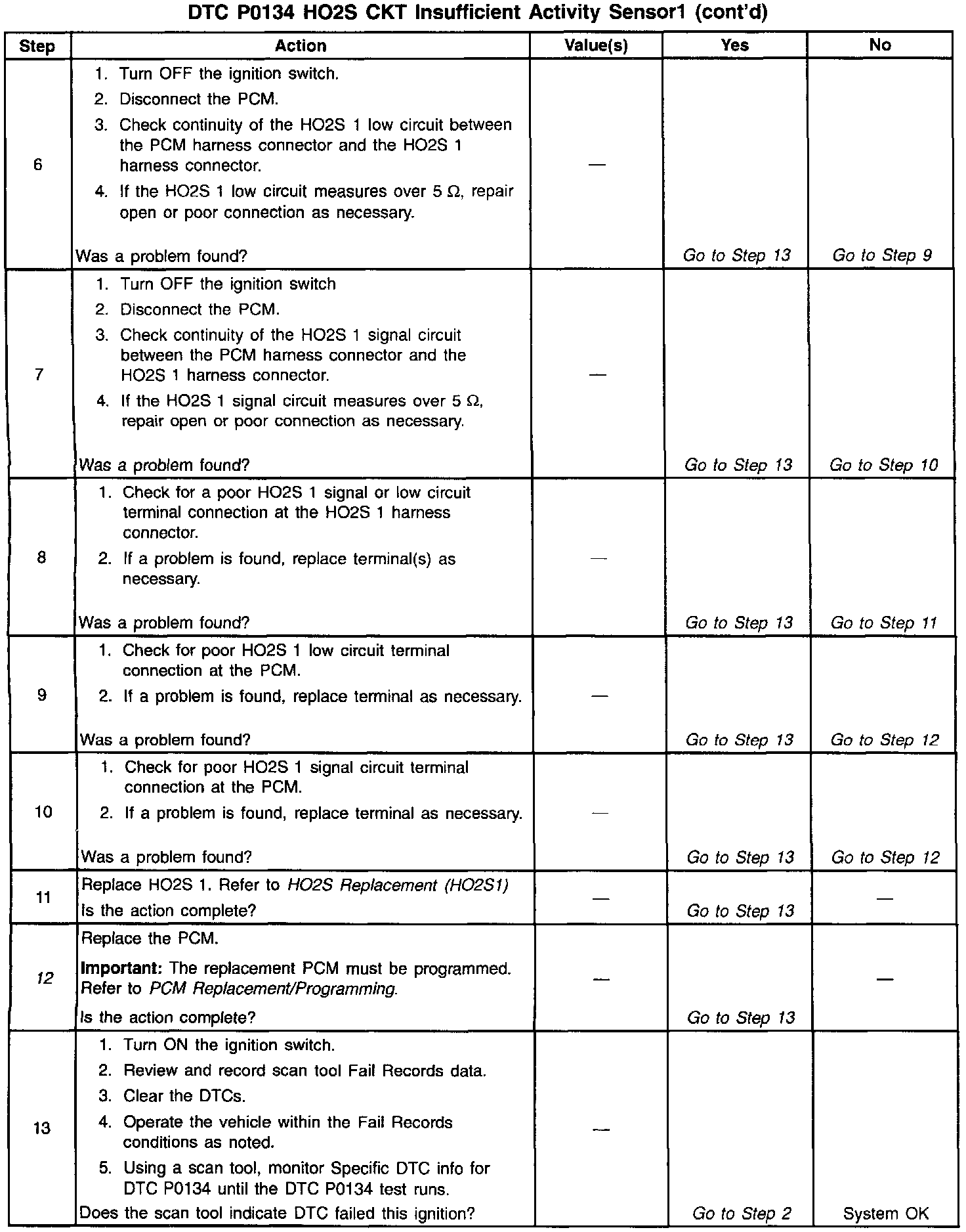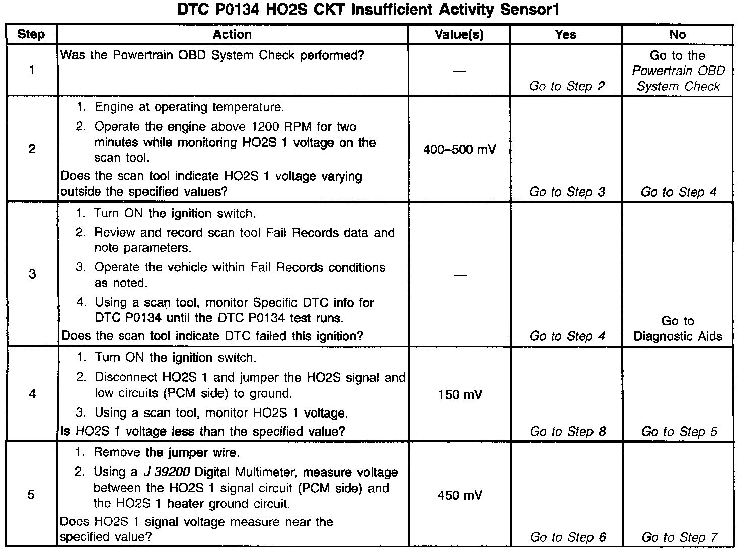The PCM supplies a bias voltage of about 450 mV between the HO2S signal and low circuits. When measured with a 10 megohm digital voltmeter, this may display as low as 320 mV. The oxygen sensor varies the voltage within a range of about 1000 mV when the exhaust is rich, down through about 10 mV when exhaust is lean. The PCM constantly monitors the HO2S signal during closed loop operation and compensates for a rich or lean condition by decreasing or increasing injector pulse width as necessary. If the HO2S 1 voltage remains at or near the 450 mV bias for an extended period of time, DTC P0134 will be set, indicating an open sensor signal or sensor low circuit.