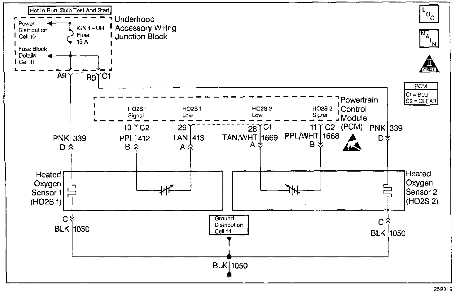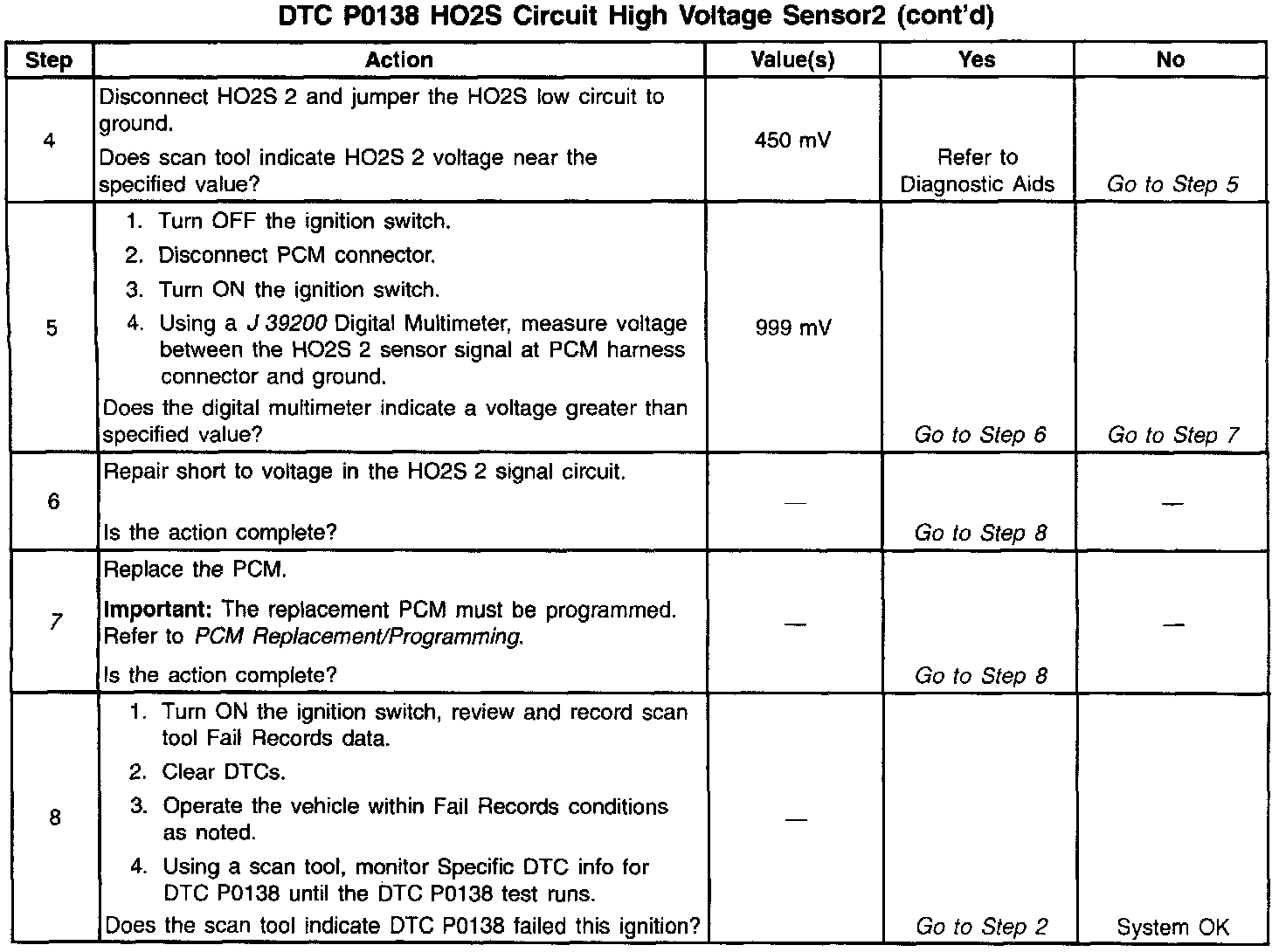 The PCM supplies a bias voltage of about 450 mV between the HO2S signal and low circuits. When measured with a 10 megohm digital voltmeter, this may display as low as 320 mV. The oxygen sensor varies the voltage within a range of about 1000 mV when the exhaust is rich, down through about 10 mV when exhaust is lean. The PCM constantly monitors the HO2S signal during closed loop operation and compensates for a rich or lean condition by decreasing or increasing injector pulse width as necessary. If the HO2S 2 voltage remains excessively high for an extended period of time, DTC P0138 will be set.