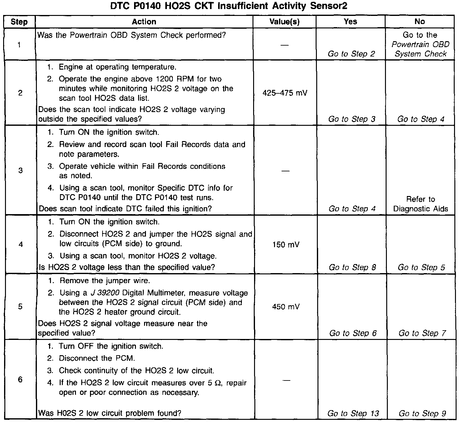 The PCM supplies a bias voltage of about 450 mV between the HO2S signal and low circuits. When measured with a 10 megohm digital voltmeter, this may display as low as 320 mV. The oxygen sensor varies the voltage within a range of about 1000 mV when the exhaust is rich, down through about 10 mV when exhaust is lean. The PCM constantly monitors the HO2S signal during closed loop operation and compensates for a rich or lean condition by decreasing or increasing injector pulse width as necessary. If the HO2S 2 voltage remains at or near the 450 mV bias for an extended period of time, DTC P01 40 will be set, indicating an open sensor signal or sensor low circuit.
