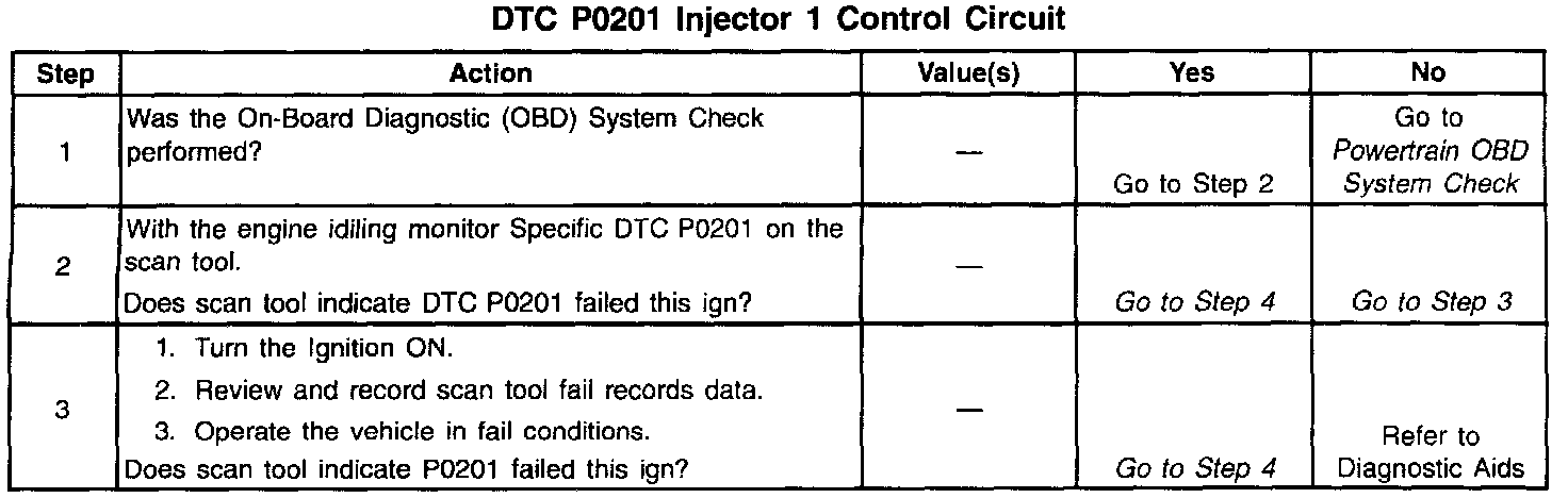 The PCM controls the fuel injectors by using an ignition feed driver and ground circuit within the PCM. The driver has the ability to detect an electrical malfunction in the ignition feed or ground circuit. If an electrical malfunction occurs in the fuel injector circuit for engine cylinder #1, the ignition feed driver signals the PCM to set DTC P0201.