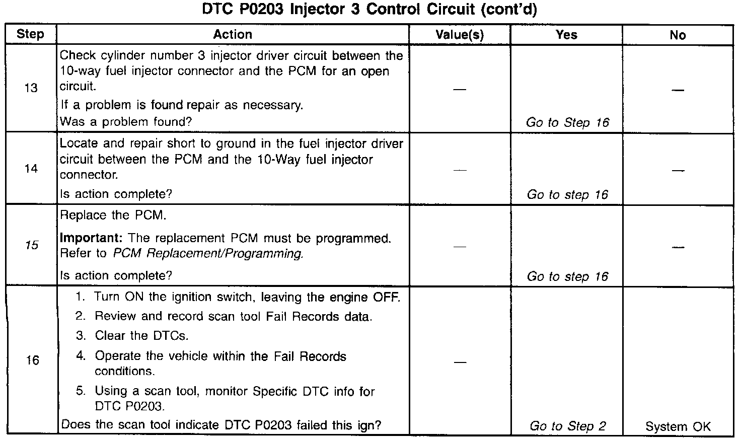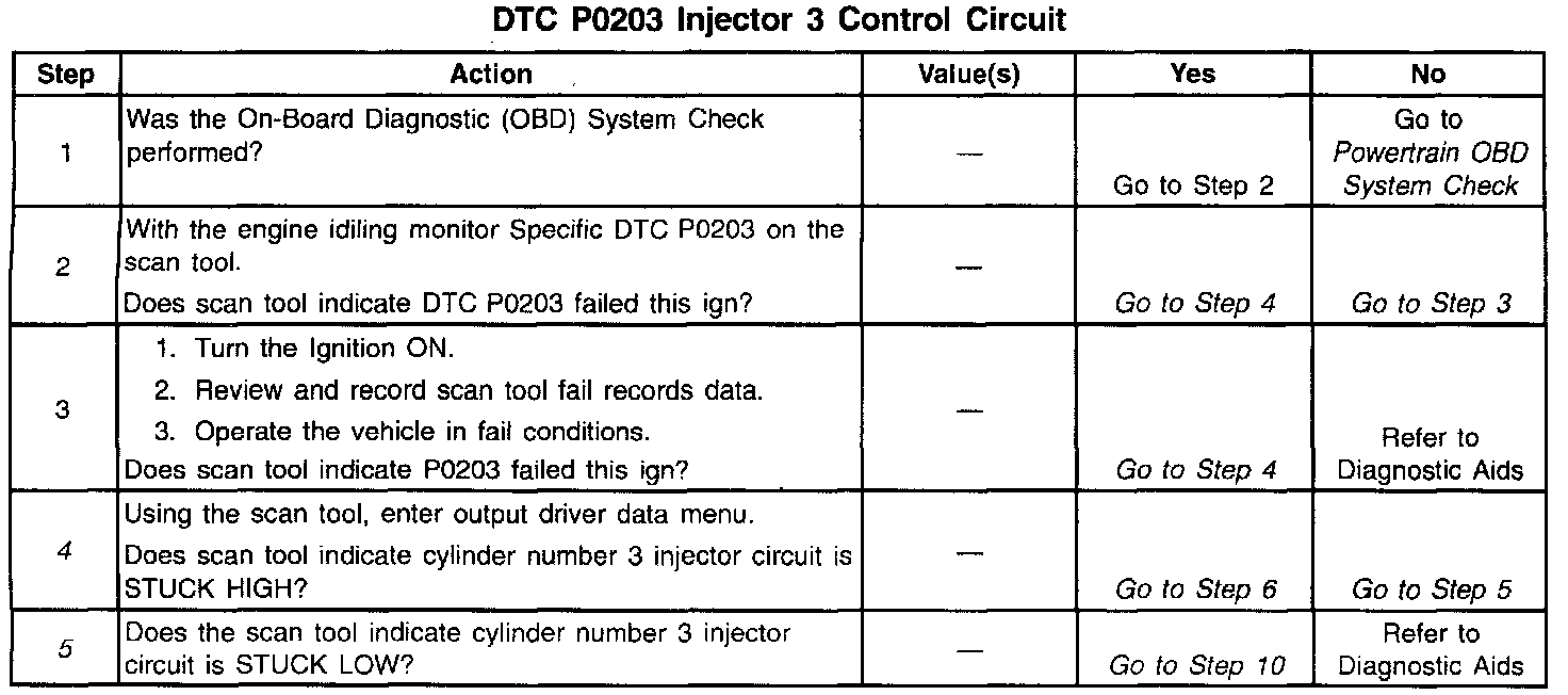 The PCM controls the fuel injectors by using an ignition feed driver and ground circuit within the PCM. The driver has the ability to detect an electrical malfunction in the ignition feed or ground circuit. If an electrical malfunction occurs in the fuel injector circuit for engine cylinder #3, the ignition feed driver signals the PCM to set DTC P0203.