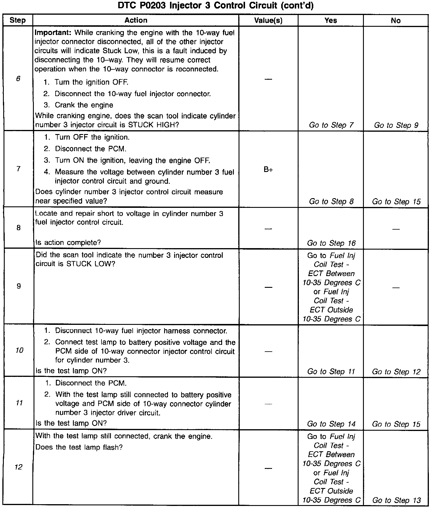 If the scan tool indicates a STUCK HIGH while cranking, the short to battery positive voltage is between the 10-way connector and the PCM. If the scan tool indicates STUCK LOW while cranking the short to battery positive voltage is between the 10-way connector and the fuel injector.