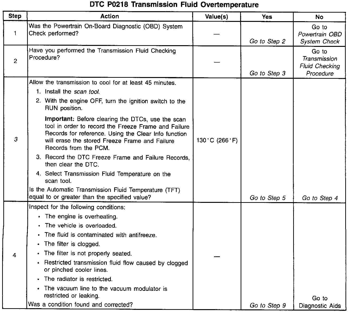 When the PCM detects a low TFT sensor resistance (high transmission temperature) for an extended period of time, then DTC P0218 sets. DTC P0218 is a type D DTC.
