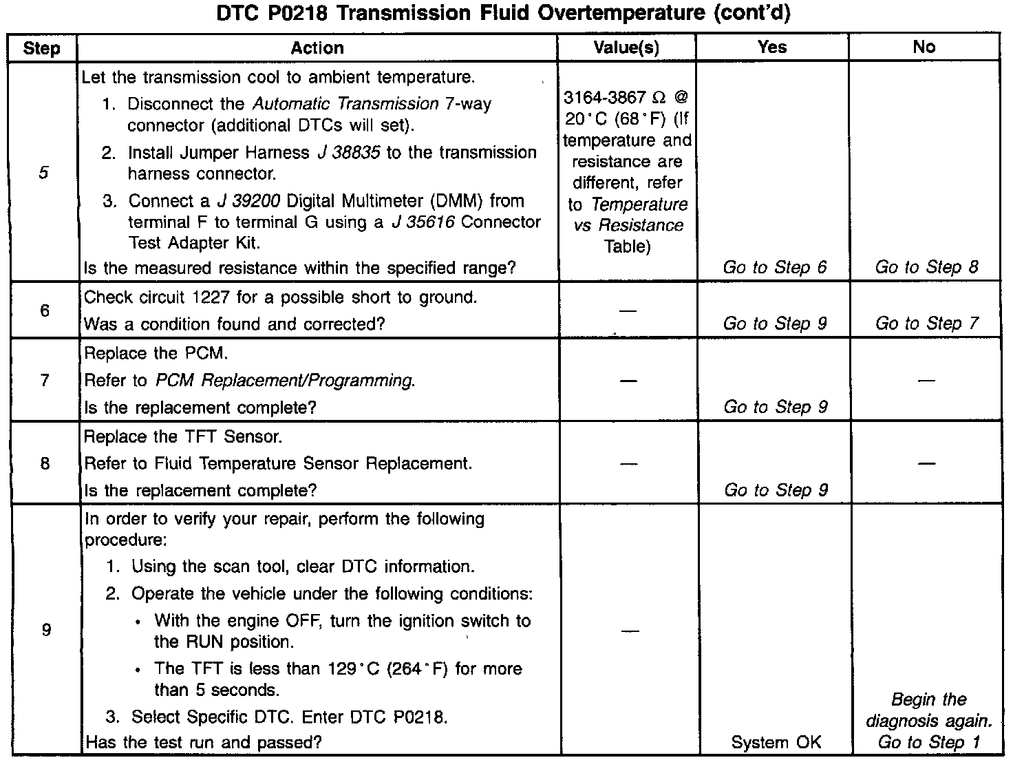 5. This step checks the TFT Sensor against the Temperature vs Resistance Table to Diagnose the possibility of a skewed (mis-scaled) sensor.