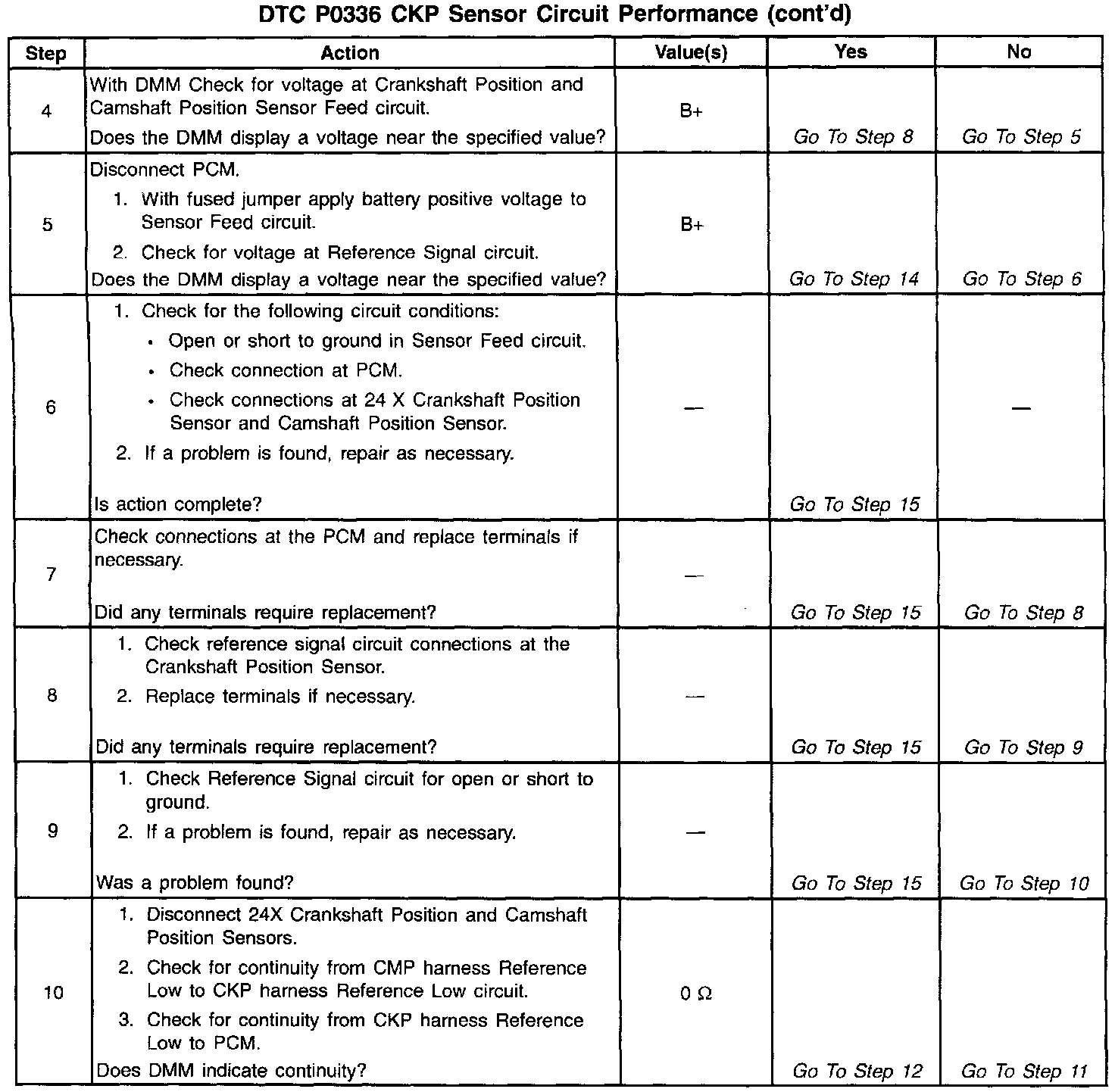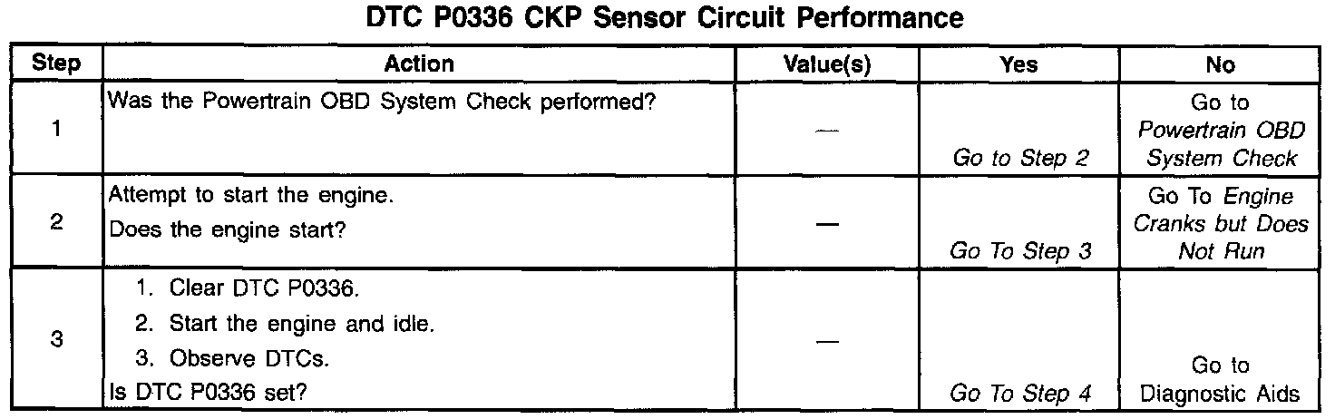 The 24X reference signal is used to improve idle spark control at low engine speeds. The PCM uses the 24X reference signal to calculate engine rpm and crankshaft position at engine speeds below 1200 rpm. The PCM constantly monitors the number of pulses on the 24X reference circuit and compares the number of 24X reference pulses to the number of 3X reference pulses and CAM signal pulses being received. If the PCM receives an incorrect number of pulses on the 24X reference circuit, DTC P0336 will set and the PCM will use the 3X reference signal circuit for fuel and ignition control. The engine will continue to start and run using the 3X reference and CAM signals only.