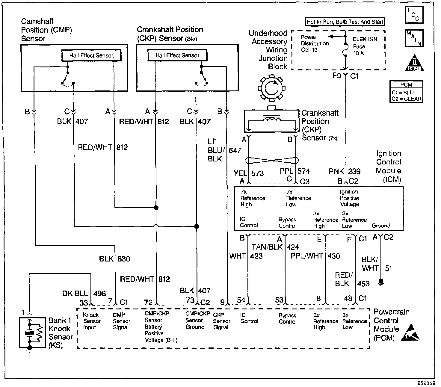 - Damaged harness. Inspect the wiring harness for damage. If the harness appears to be OK, disconnect the PCM, turn the ignition ON and observe a voltmeter connected to the 24X reference circuit at the PCM harness connector while moving connectors and wiring harnesses related to the 24X Crankshaft Position Sensor and Camshaft Position Sensor. The 24X and Camshaft Position sensors share the same sensor feed from the PCM. A change in voltage will indicate the location of the fault.