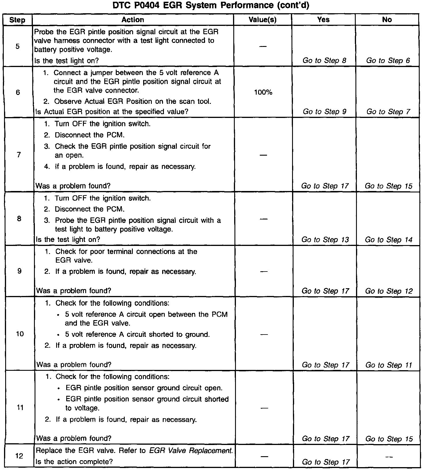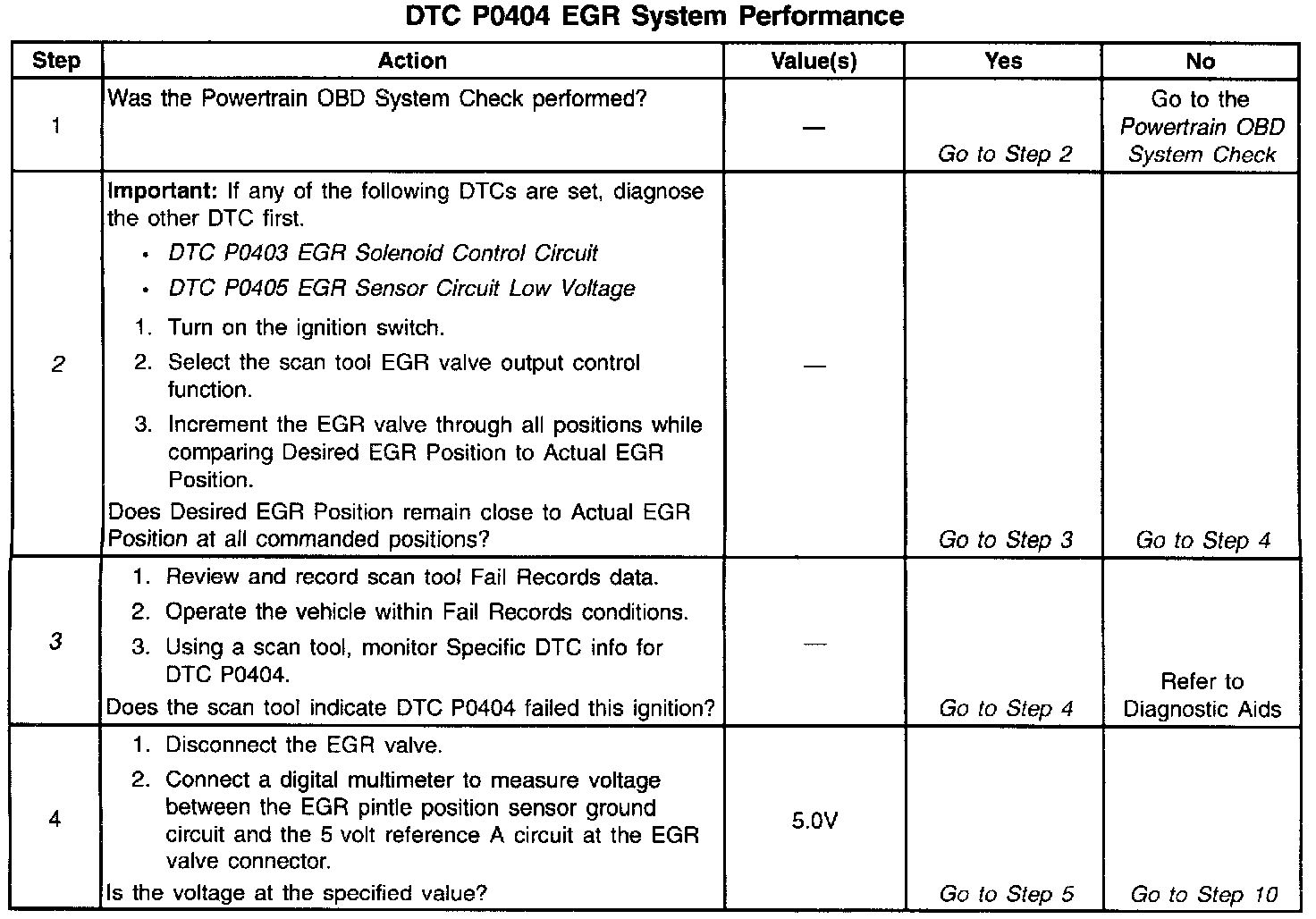 3. If DTC P0404 will only set under certain conditions, the malfunction may be intermittent, refer to DIAGNOSTIC AIDS. If an intermittent wiring problem is not present, check for a poor connection at the PCM or the EGR valve. If the connections are OK and DTC P0404 continues to set, replace the EGR valve. Refer to EGR Valve Replacement.