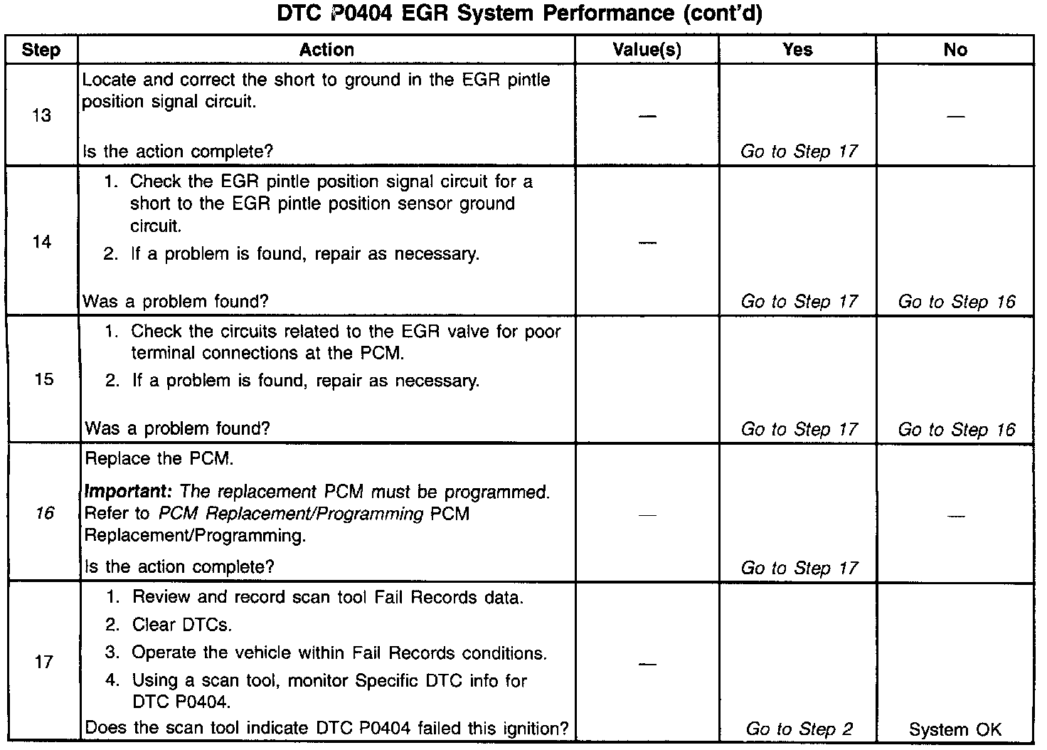 The PCM monitors the EGR valve pintle position input to ensure that the valve responds properly to commands from the PCM. The PCM compares Actual EGR Position with Desired EGR Position when the valve is commanded open. If Actual EGR Position is 15% less than Desired EGR position when the PCM is commanding the EGR valve opened, DTC P404 will set.