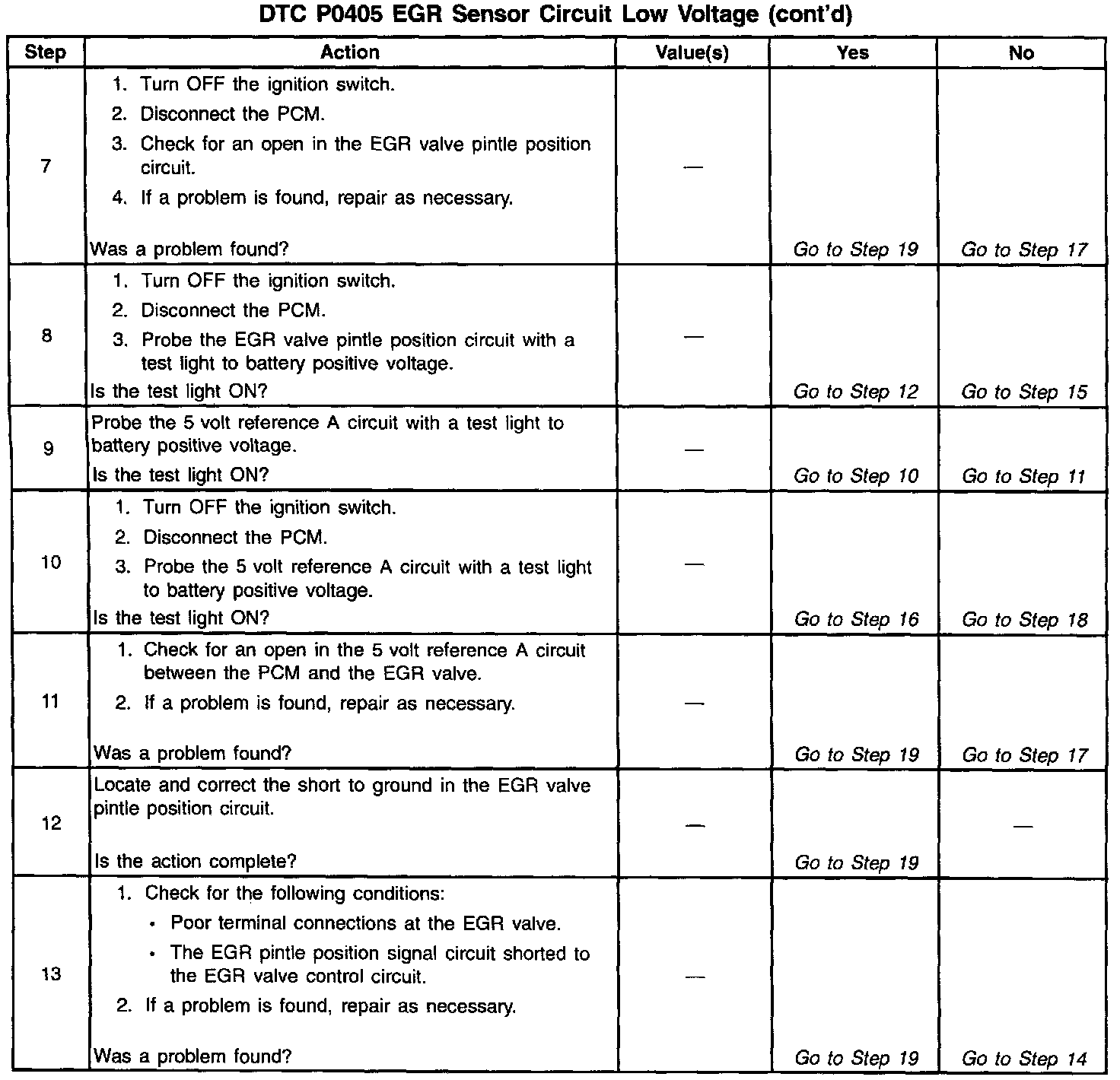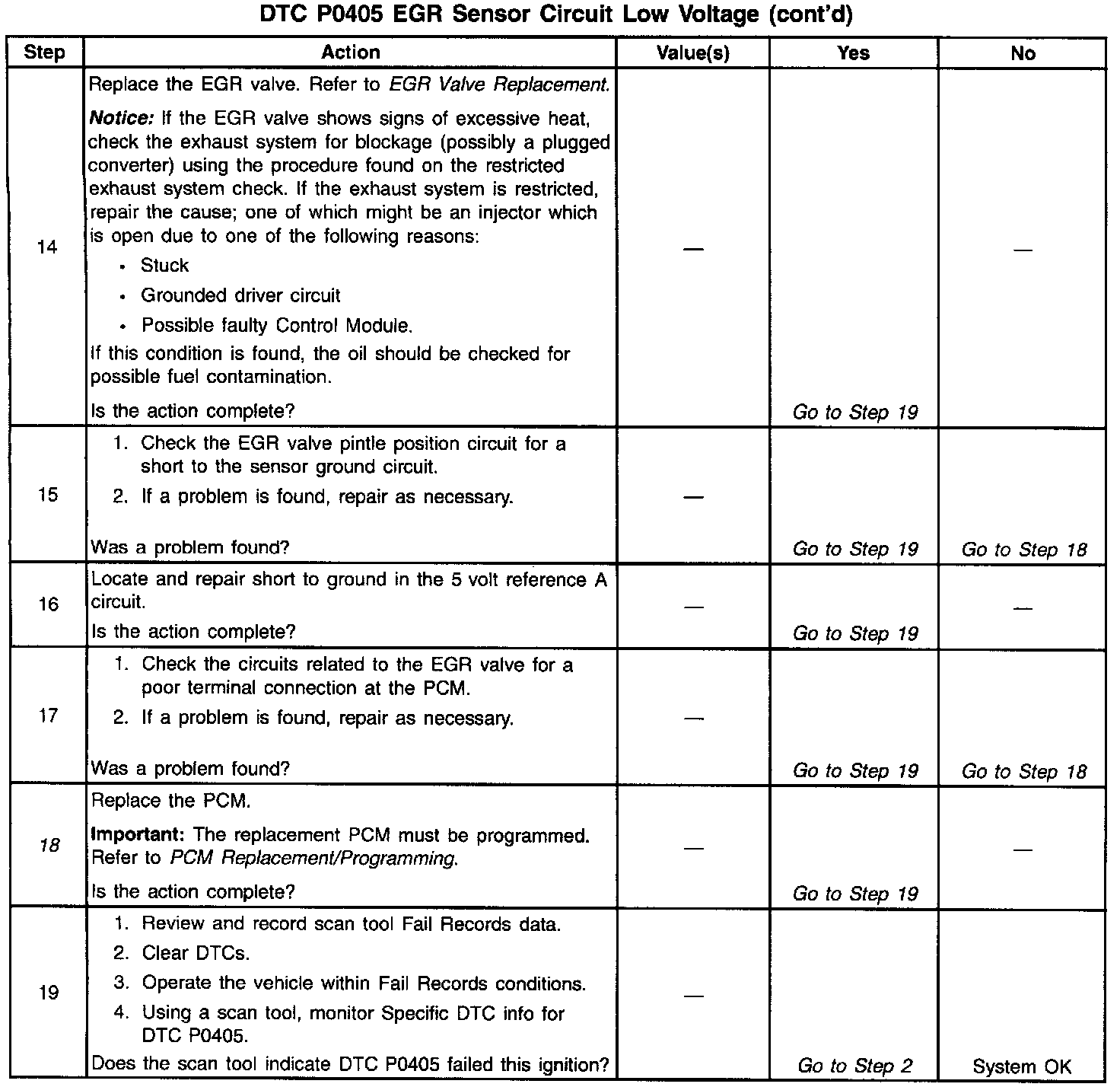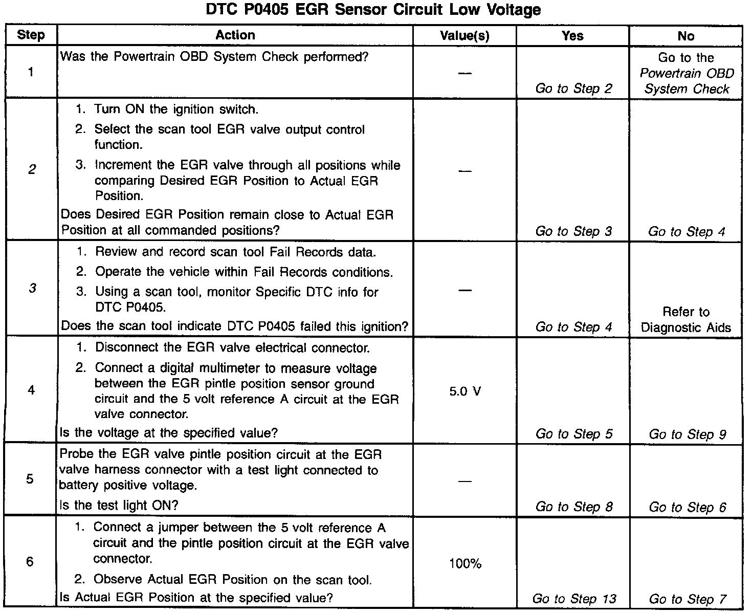 The PCM monitors the EGR valve pintle position input to ensure that the valve responds properly to commands from the PCM and to detect a fault if the pintle position sensor circuit is open or shorted. If the PCM detects an excessively low EGR Feedback signal voltage, DTC P0405 will set.